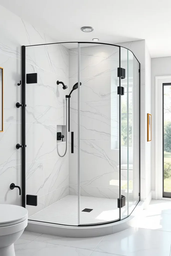 I usually choose ultra transparent tempered glass and simple chrome or matte black fastenings. Towel bars when constructed as door handles are efficient sources of door handles. In case there is a space, I fit walk in showers with floor level drainage which eliminates the need to have thresholds and makes the shower more friendly to people with disabilities.