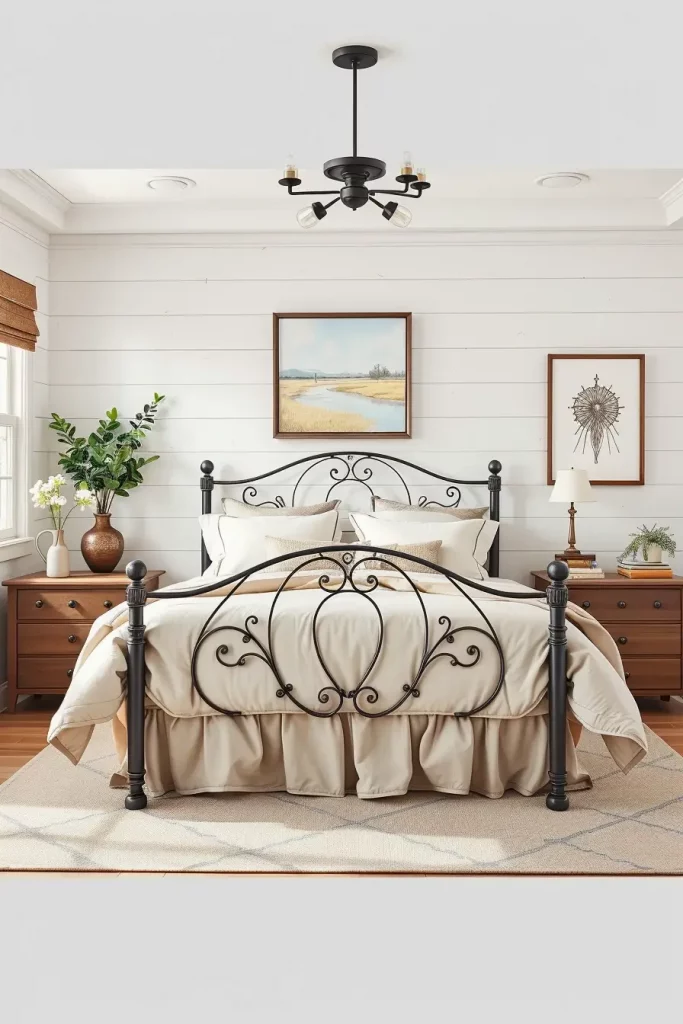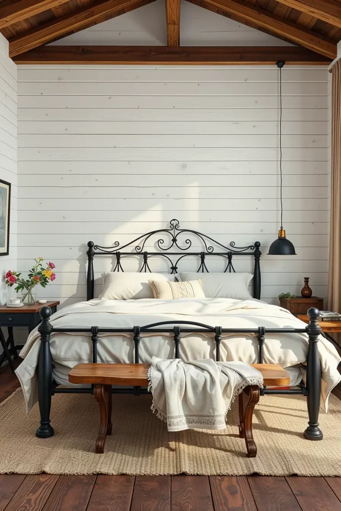 I tend to choose a bed that is matte-blacked or bronze. This is exquisitely in contrast with white walls or shiplap. To get a more sophisticated appearance, I match the bed with extra bed linen blankets and some wooden bench at foot end. The room has a unified aspect with the visual balance that is created through the contrast between hard and soft materials.