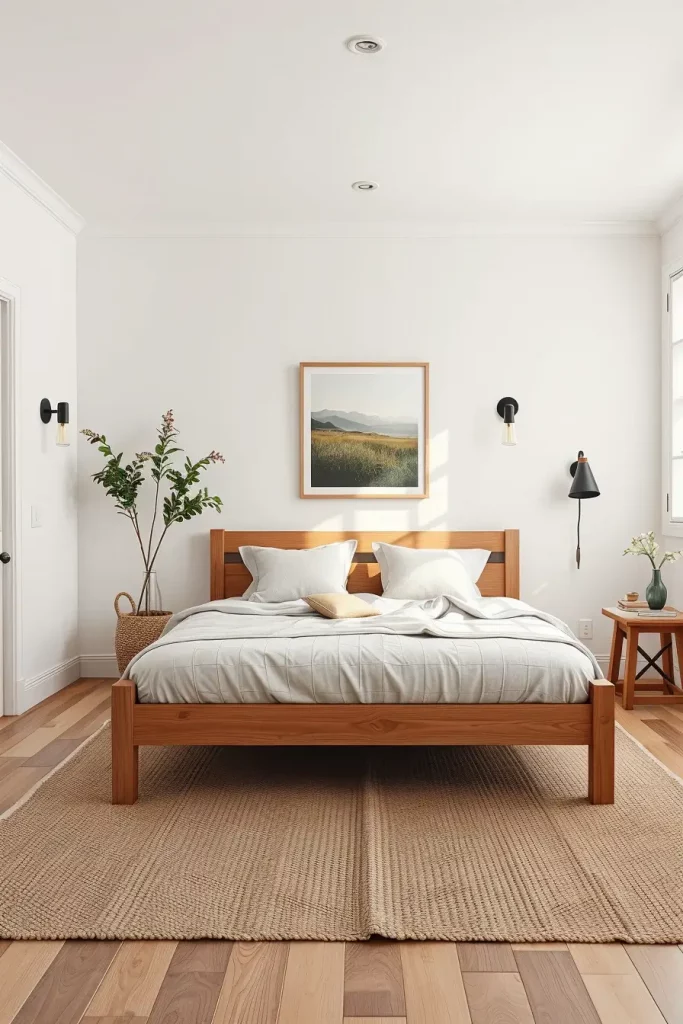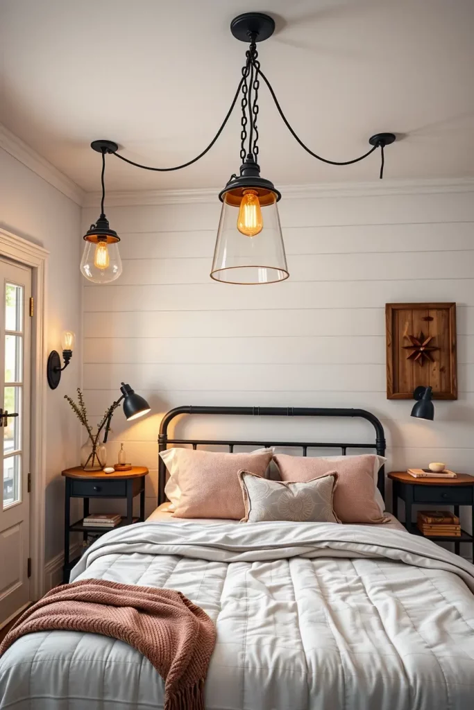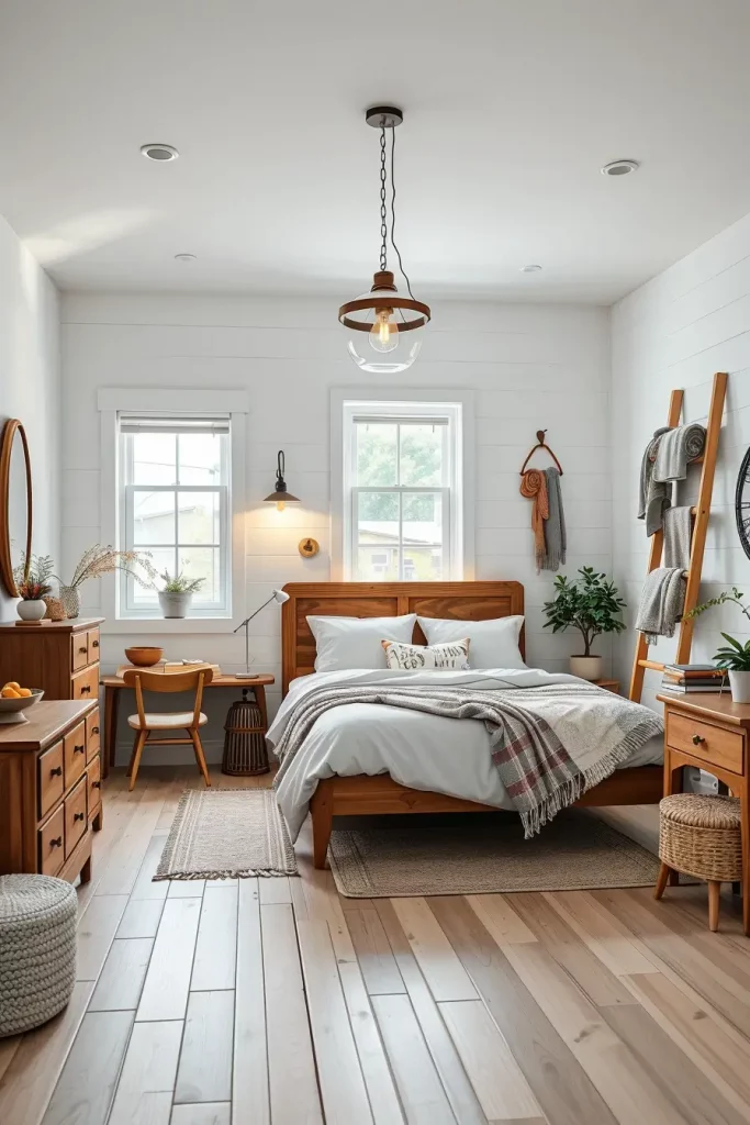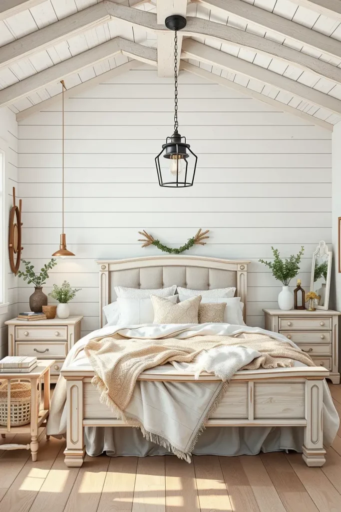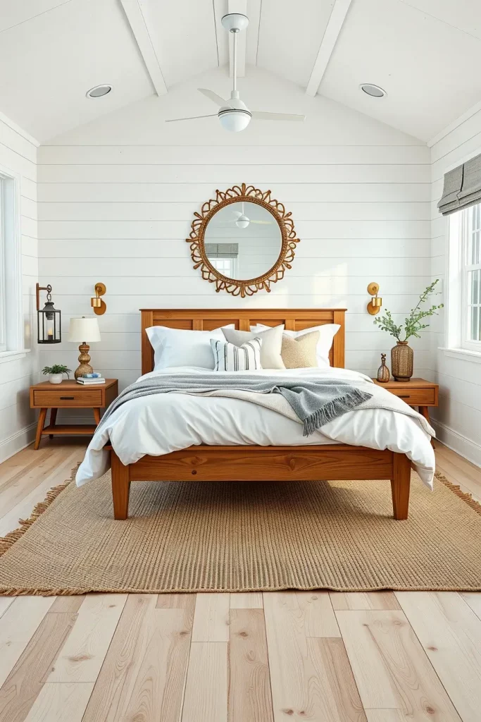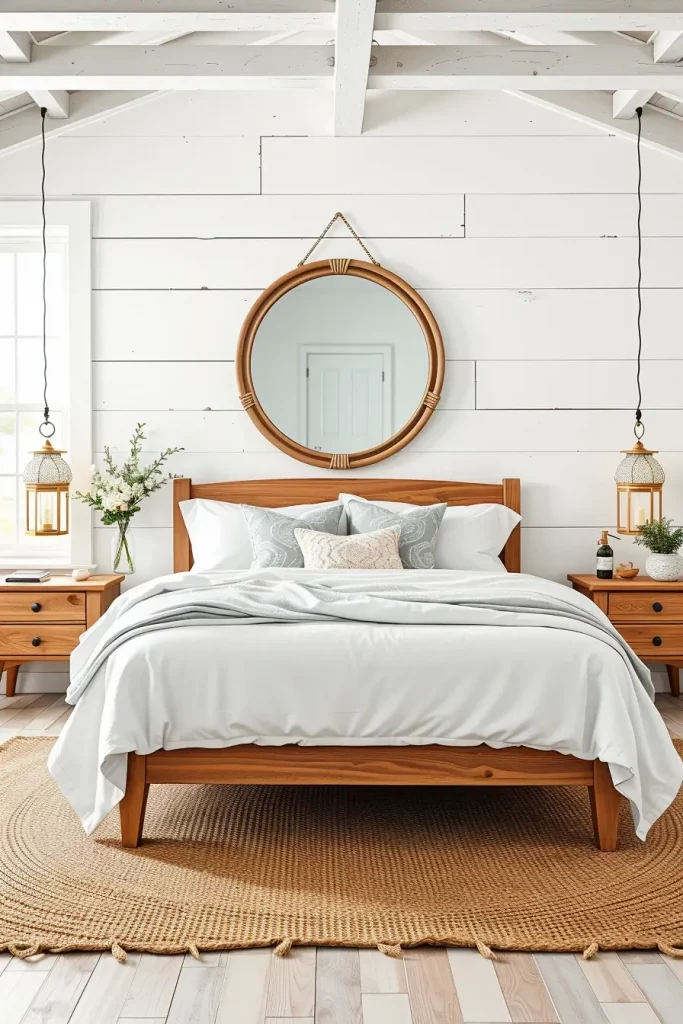 I did a bedroom recently that had shiplap walls and were painted a crisp white and the bed was low profile oak with clean Scandinavian lines. The Scandinavian theme was retained by the chunky knit throw, plain-looking nightstands, and the touch of the jute rug and the driftwood mirror, which introduced a hint of the coastal vibe. Then the farmhouse spirit manifested in the old lanterns as bedside lamps and the old barn door as headboard background. Such mixture of the styles renders the space friendly and sophisticated.