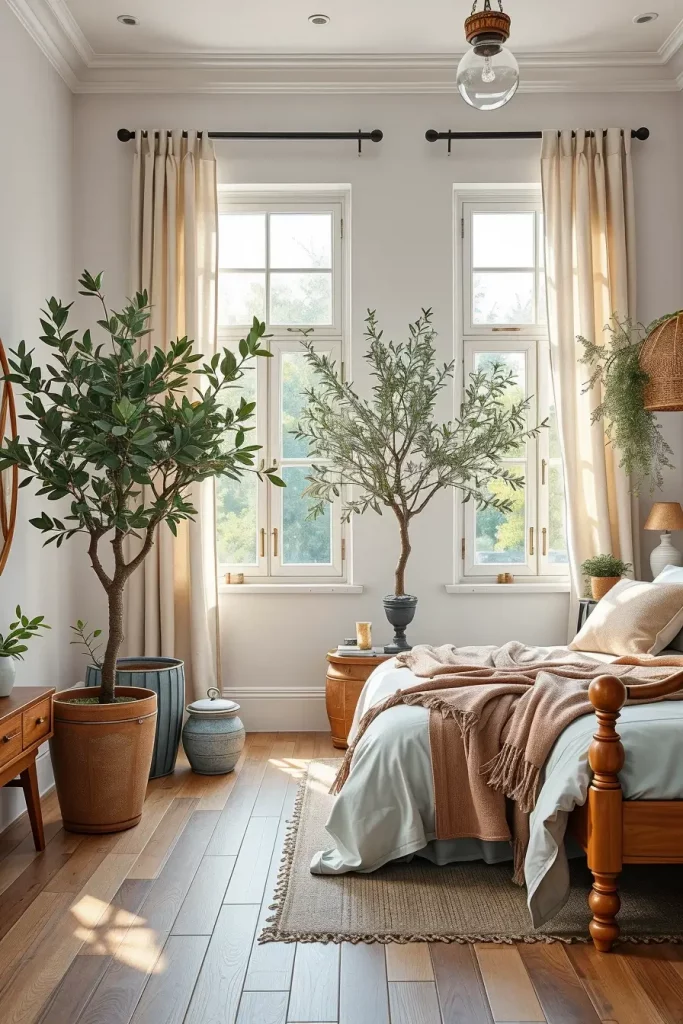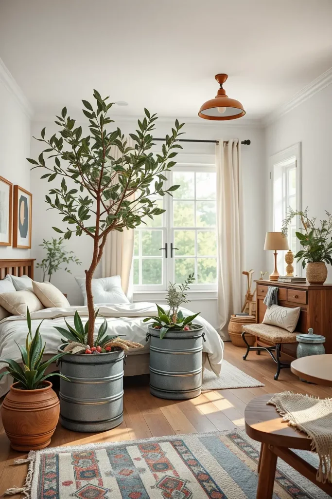 Normally, I utilize the farmhouse style by using stone, galvanized metal, or clay pots. Some of the common plants that people prefer to use are snake plants, olive trees and eucalyptus. These are affordable to maintain and attractive. I put them alongside windows, on nightstands or on dressers. Wall-hanging pots and hanging planters are also very beautiful in confined areas.