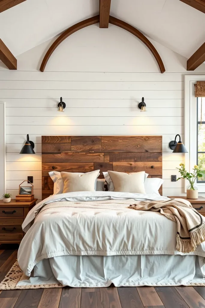 There is no more farmhouse piece of decor than a headboard made of reclaimed wood. It is an eye-catching detail providing a balance between the rustic look and sustainability, one of the central principles of the modern farmhouse bedroom design. I want to always remember this piece that it can be the highlight which will define the mood of the room.