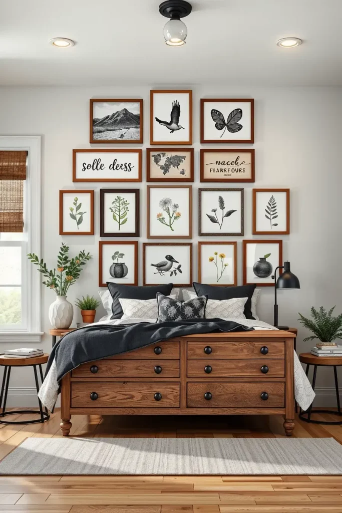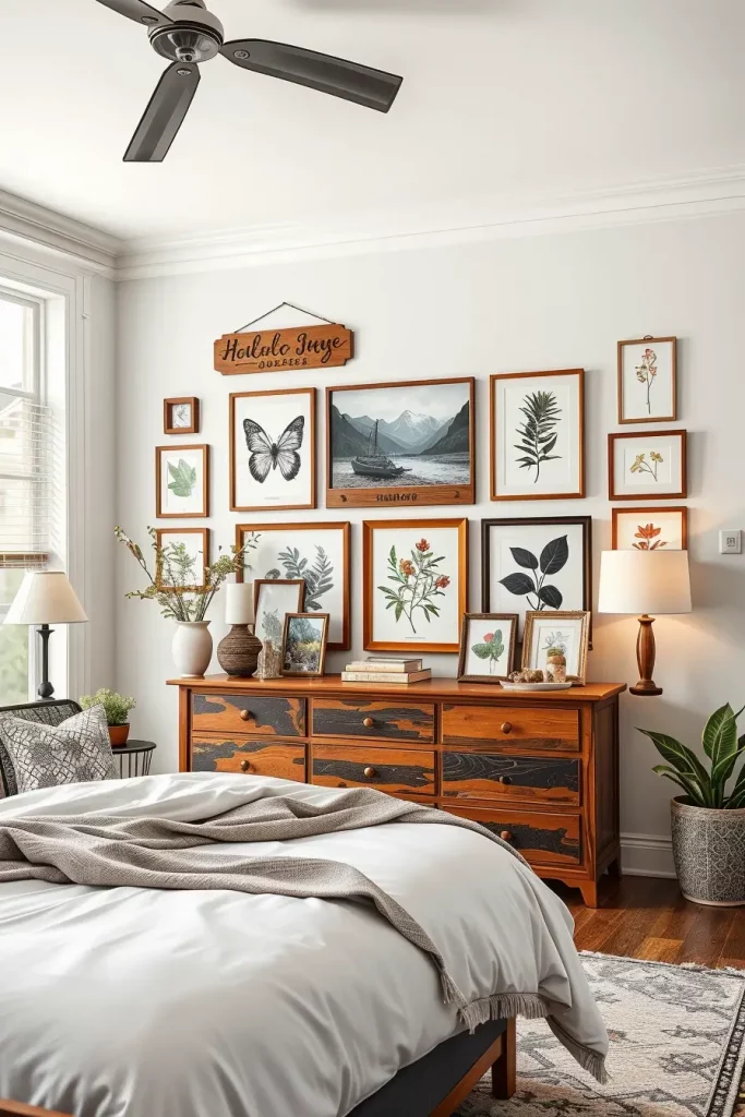 I always choose framed botanical illustrations, old clocks, and wooden signs with phrases on it. I also enjoy the grouping of small framed objects in larger gallery formations either over a dresser or with a large print picture landscape above the bed. The overall effect is made heavy and stable with use of neutral colors and organic landscape.