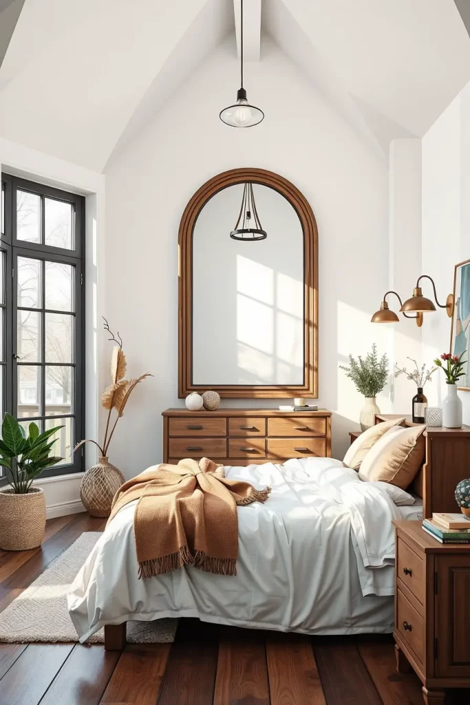 My preferred mirrors are typically arched or a rectangular shape on a wood frame with a distressed look and finish, or a reclaimed wood treatment. A hanging above a dresser or a tall mirror leaned against the wall both carries charm and height. In small size bedrooms, I tend to place two narrow mirrors at opposite sides of the bedroom just to be symmetrical.