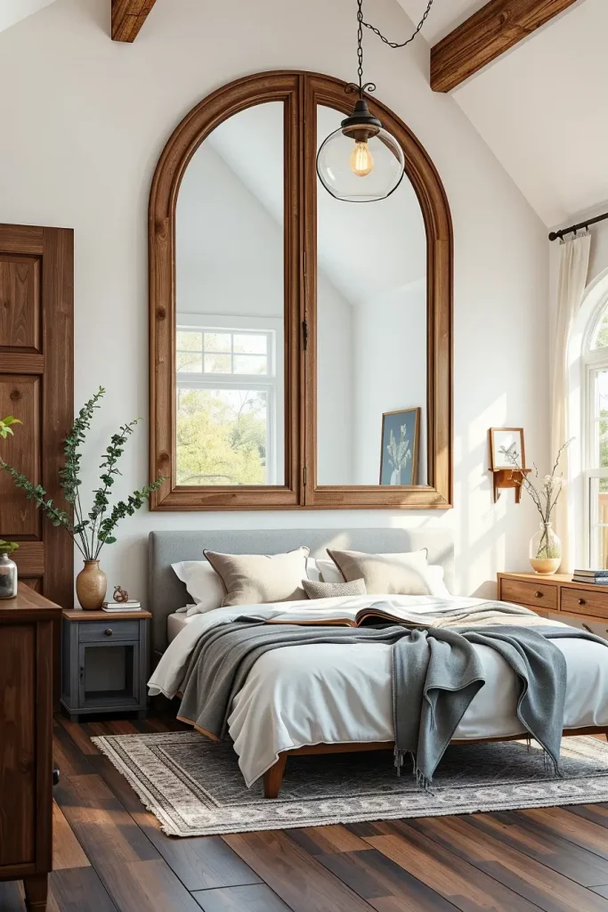 I can hardly think of a better tool to make any bedroom appear larger and brighter than mirrors and in a modern farmhouse decor context, the rustic mirrors will definitely do the trick. They reflect the light in the room and they add elegant framing, which balances the warmth of the wood colors this style is known to have.