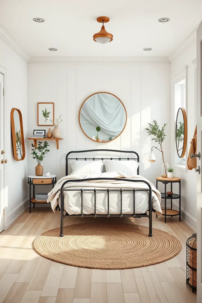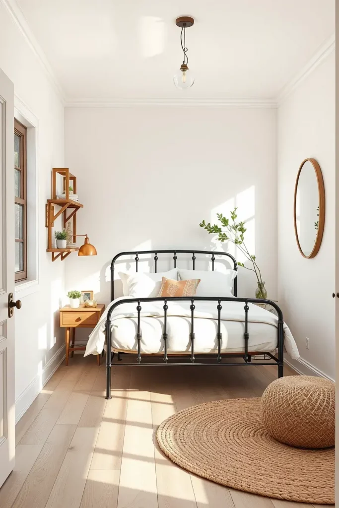 I like to use a foldable metal bed frame, wall-mounted bedside tables and a floating shelf to act as a substitute dresser or workspace. White soft walls and light wood floorings look so bright and increase the size of the room. Underfoot is a round jute rug that provides a texture but does not gum up the works and mirrors or windows are maximised to provide as much light as possible.