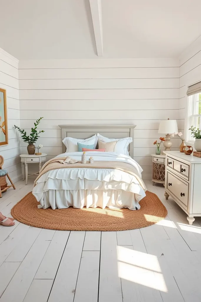 One of my color schemes is putting white shiplap walls with linen duvet, puffy pillowcases and jute rug. Soft tones may be blush pink throw pillows, washed blue ceramic lamps or even weaved baskets to store. Such incorporations add a visual layer preceding the distraction of the calmness of the area.