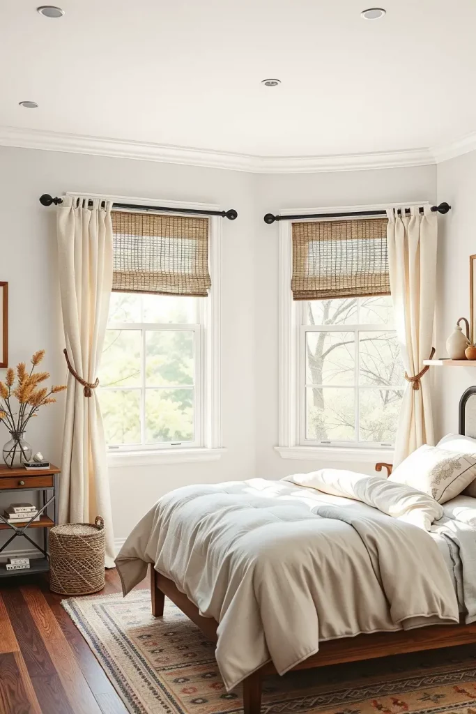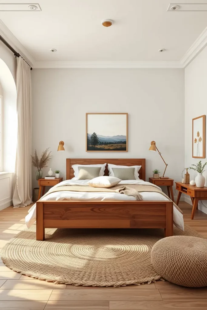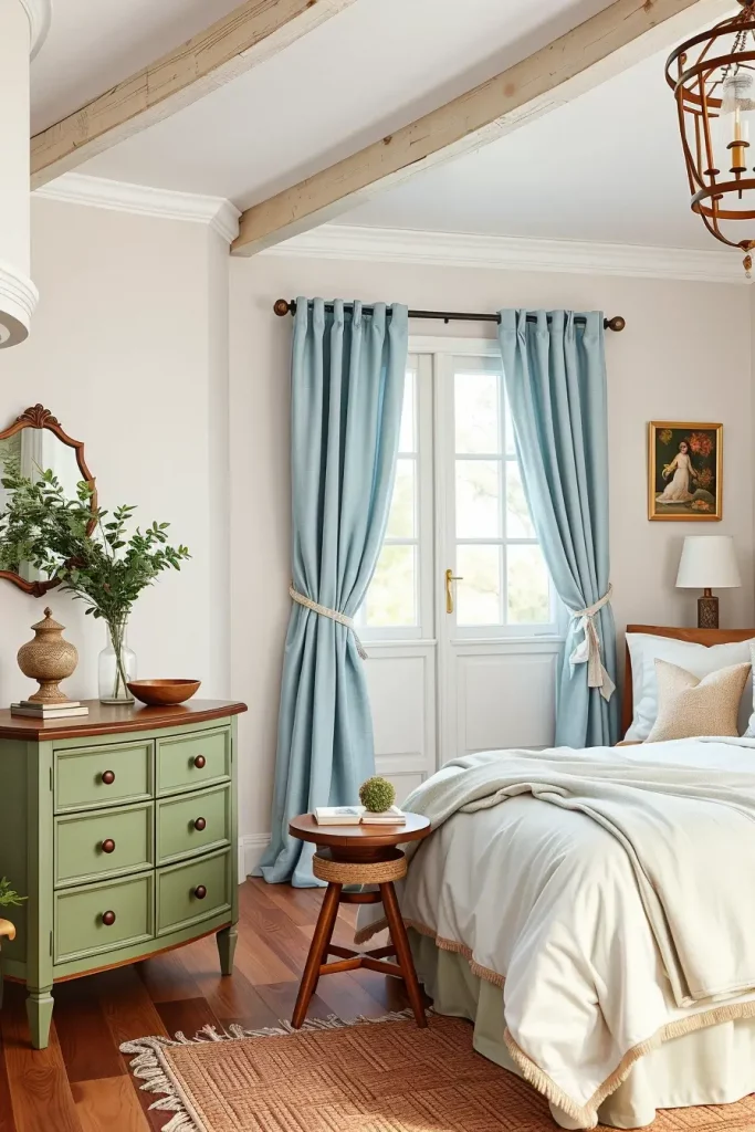 The paint colors I like on the walls are matte creamy whites or greige. Household items such as bedding (tawny or cream-colored) match wooden or black iron beds. Muffled interest is partially gained with throw pillows in dusty blue or sage. When you want natural light to enter, you should have lightweight curtains that are linen and in off-white or gray. The tones are ideal to present warmth and texture.