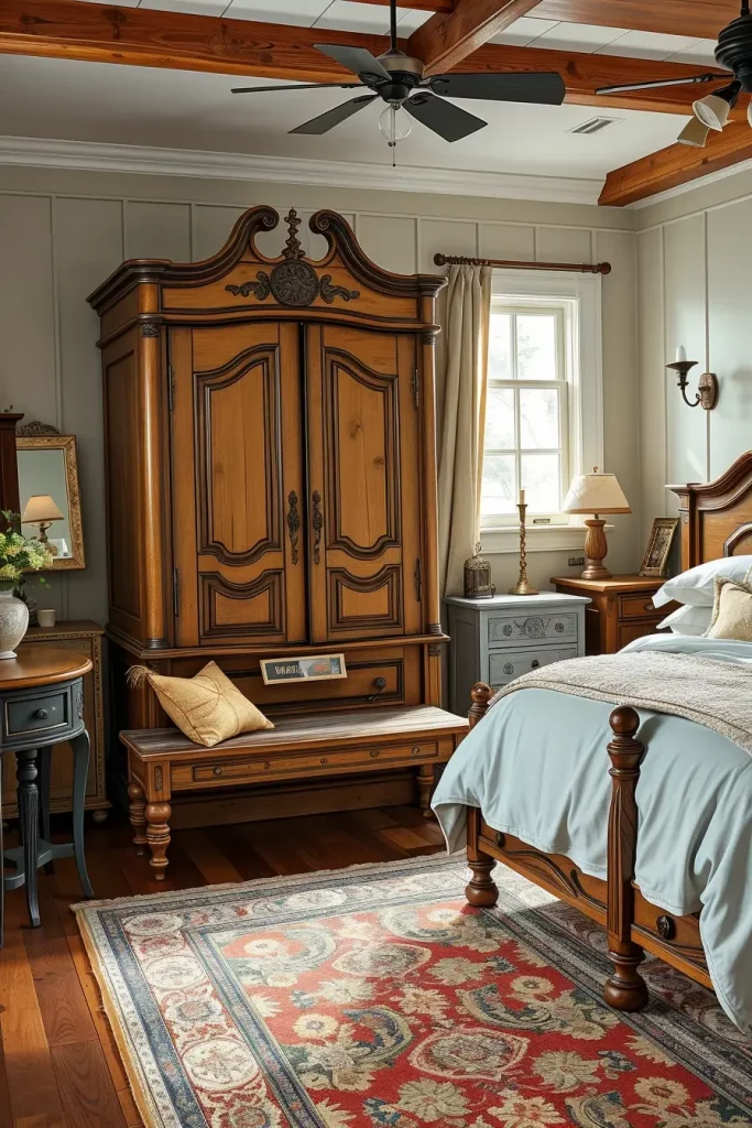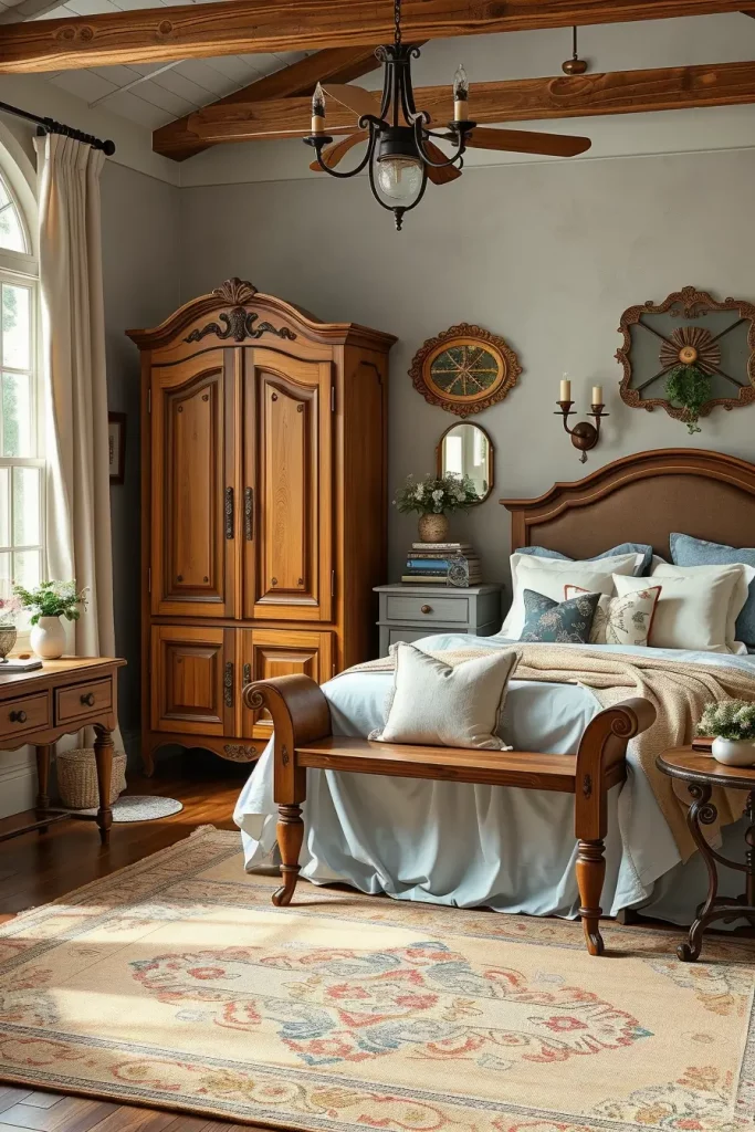 I did use a distressed armoire with original brass hardware in one of my own projects as the main feature in the room. I have matched it to a reclaimed wood bench at the foot of the bed and a series of bedside tables that are mismatched, all in their choice of soul. The bed was flanked by wrought iron candle sconces and the room was grounded by and antique area rug underneath the feet. The contrast of these aged pieces with the new white bedding and rectangular shaped lighting set the scene of something that was collected as opposed to chaotic.
