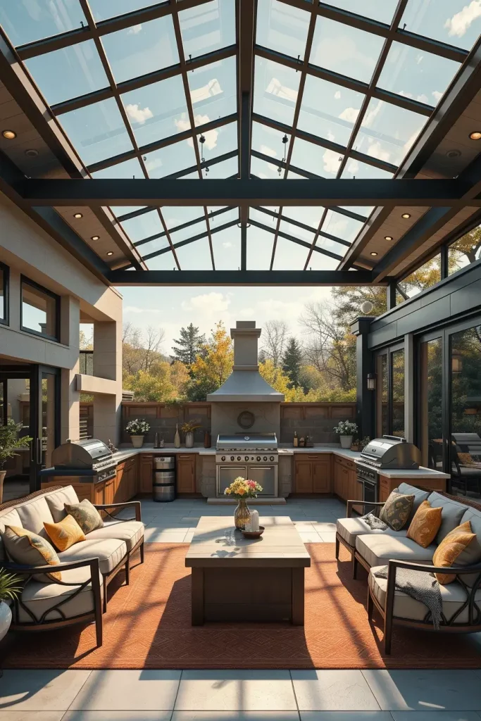 These spaces usually feature premium outdoor kitchens, upholstered weather-resistant seating, and elegant dining furniture. The glass roof allows natural light to flood the area, making it feel open even during colder or rainy seasons.