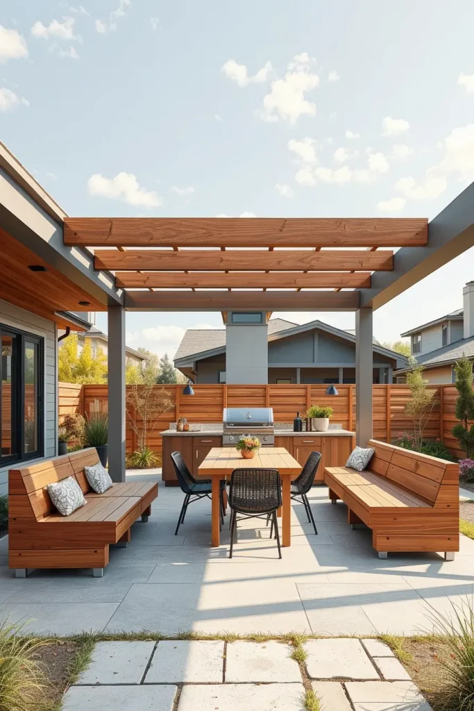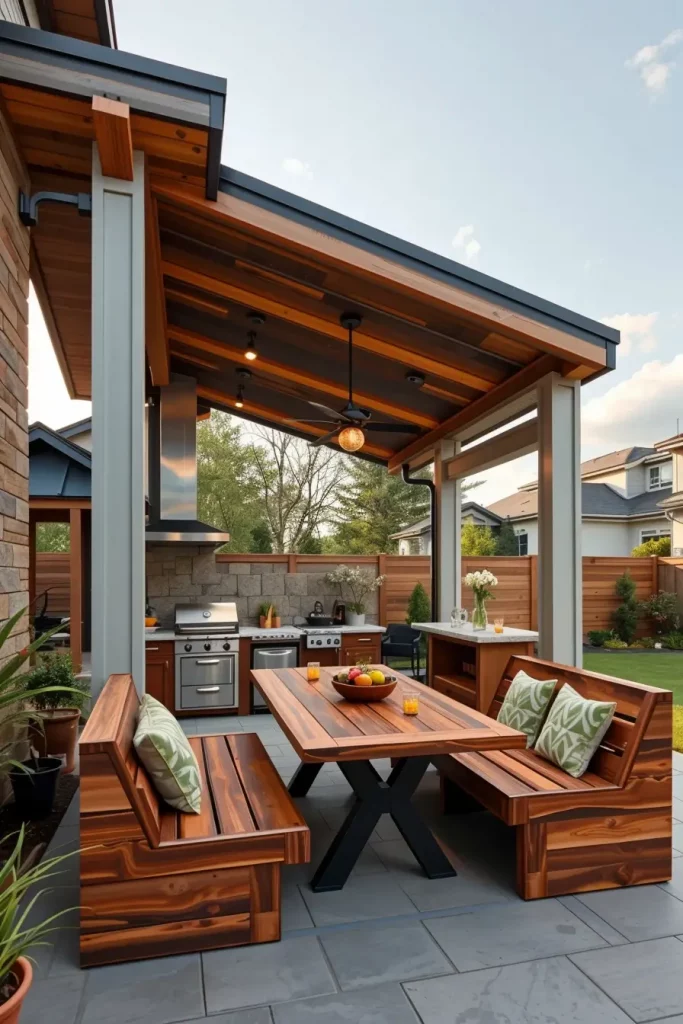 I usually incorporate a built-in grill station, seamless countertops, and integrated benches or dining tables crafted from weather-treated materials. The wooden roof works best when paired with clean-lined furniture, neutral upholstery, and subtle metal accents that reinforce a modern look without overwhelming the space.