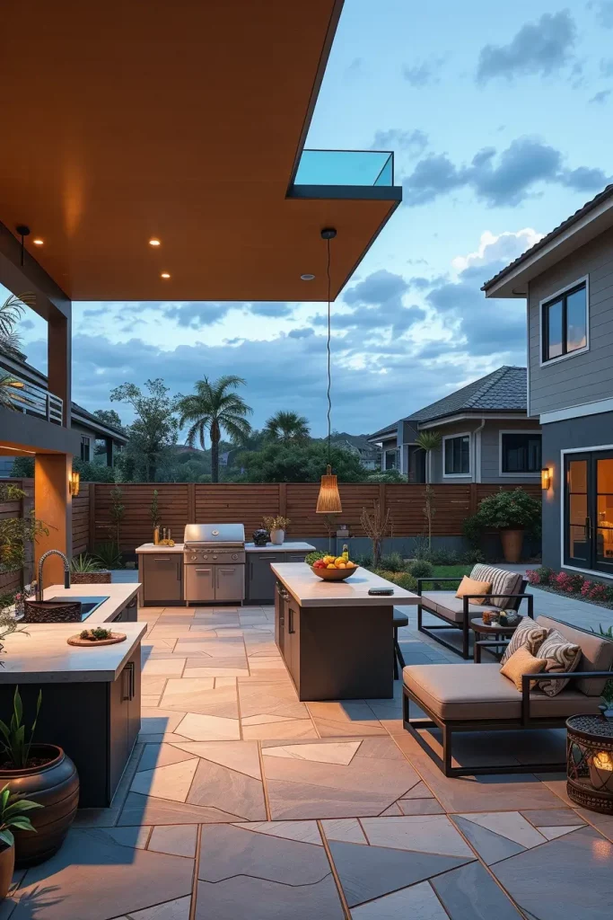 In my professional view, designers increasingly recommend fully equipped outdoor kitchens to match indoor standards. I’ve found that this approach dramatically increases how often the space is used.