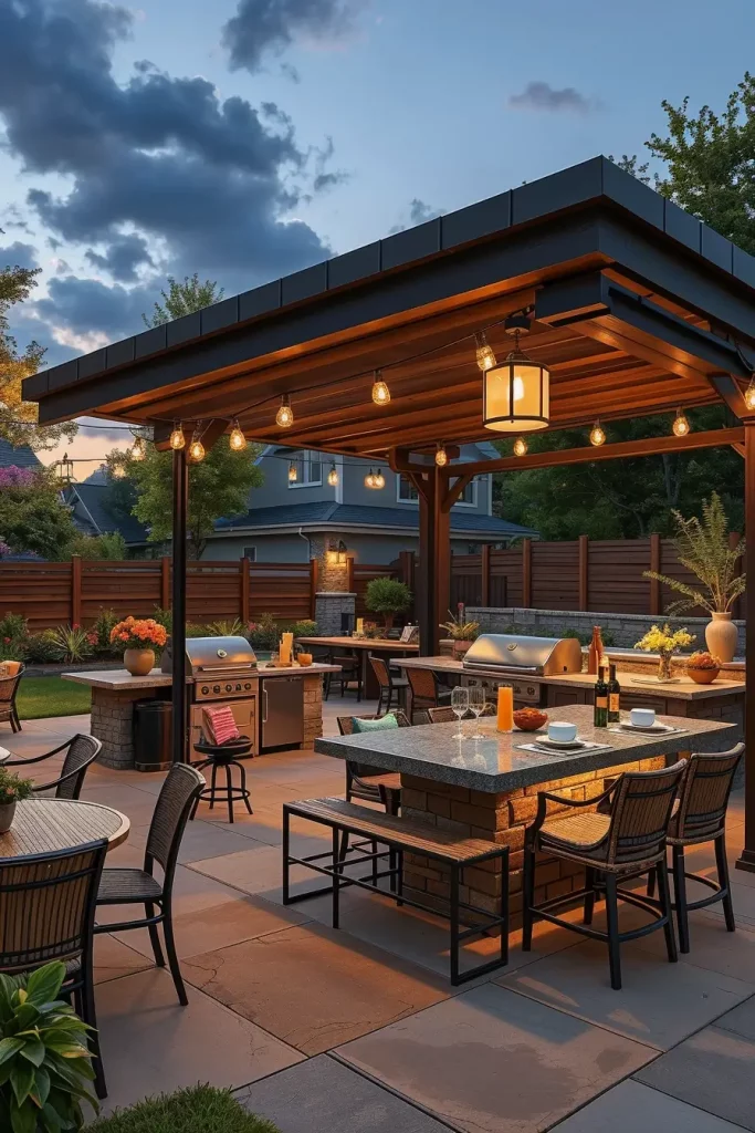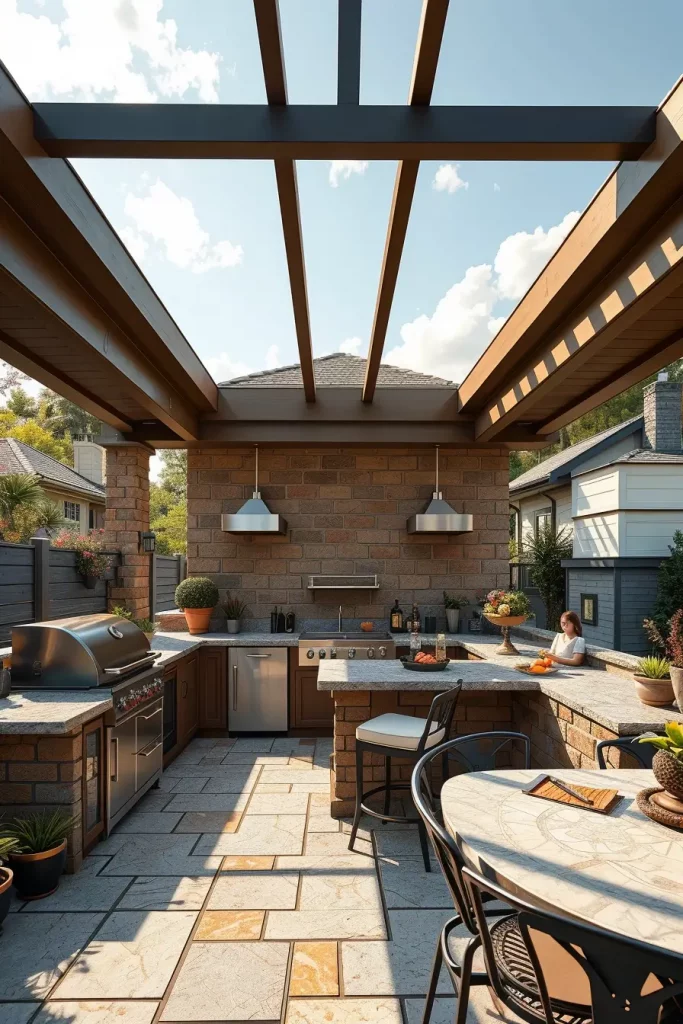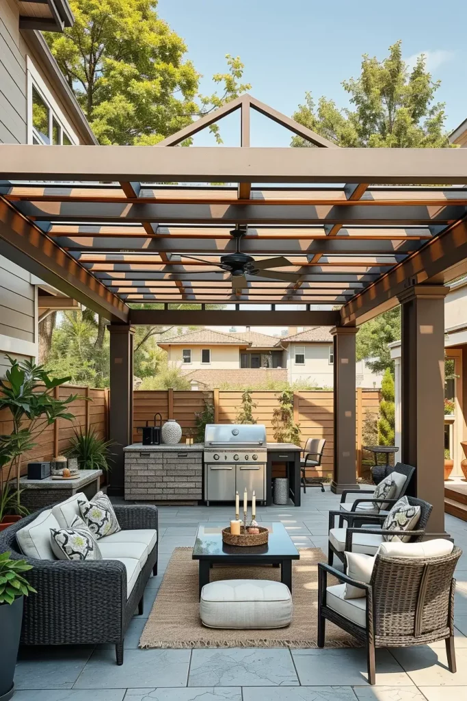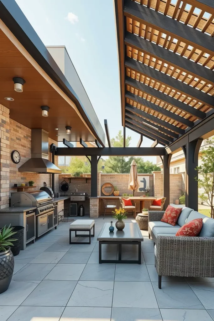I often use pergola-style roofs with solid sections over cooking areas and open slats above seating. Furniture includes weather-resistant sofas, a central dining table, and a fully equipped grill station. This layout encourages movement and flexibility.