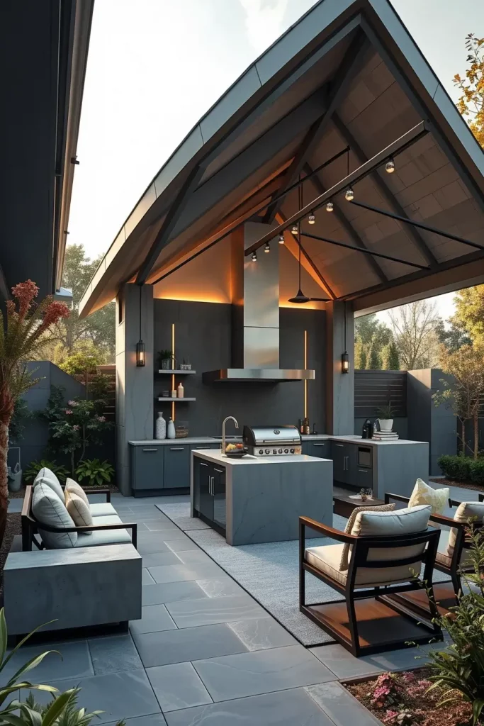 I see bold roof geometry as one of the strongest statements in a modern outdoor bbq area with roof 2026. Angular, asymmetrical, or sculptural rooflines instantly define the space and give it architectural presence. From a practical standpoint, these roofs provide excellent sun and rain protection while allowing controlled airflow, making the barbecue zone usable throughout the year.