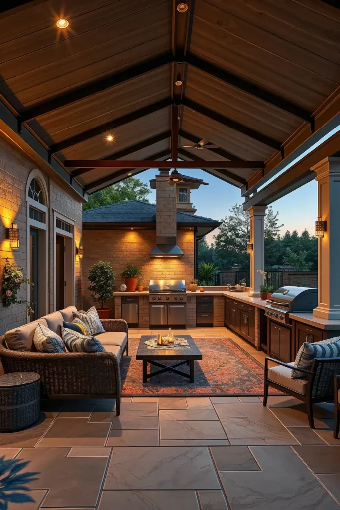 I typically include a built-in grill island, a spacious prep counter, and a separate lounge area with outdoor sofas, accent chairs, and a low coffee table. The roof often incorporates recessed lighting and ceiling fans to improve comfort. Materials are cohesive, ensuring the cooking and lounging zones feel unified.