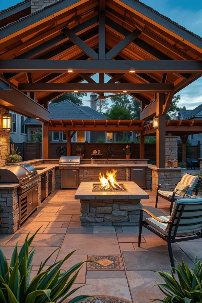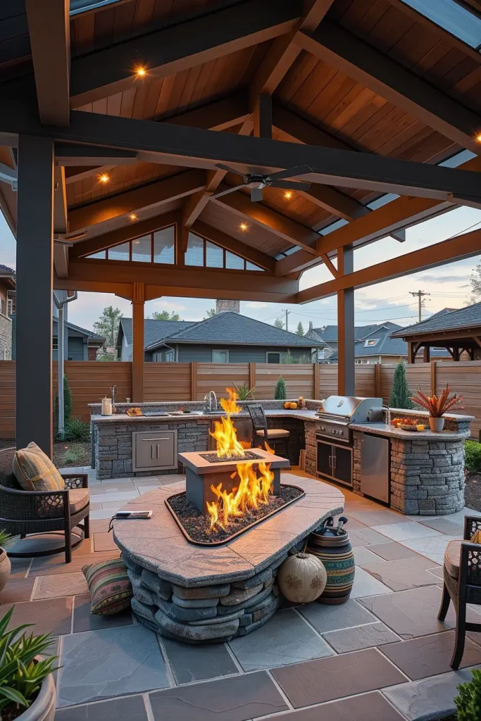 I often incorporate linear gas fire pits, fire tables, or built-in fireplaces near the dining or lounge area. The grill station remains the focal point, supported by fire-resistant materials such as stone, concrete, and metal. The roof structure helps contain heat while protecting from wind.