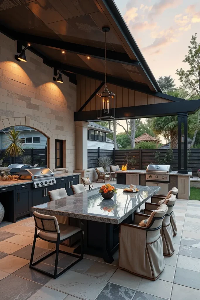 Elegant Outdoor BBQ Area With Roof And Dining Space