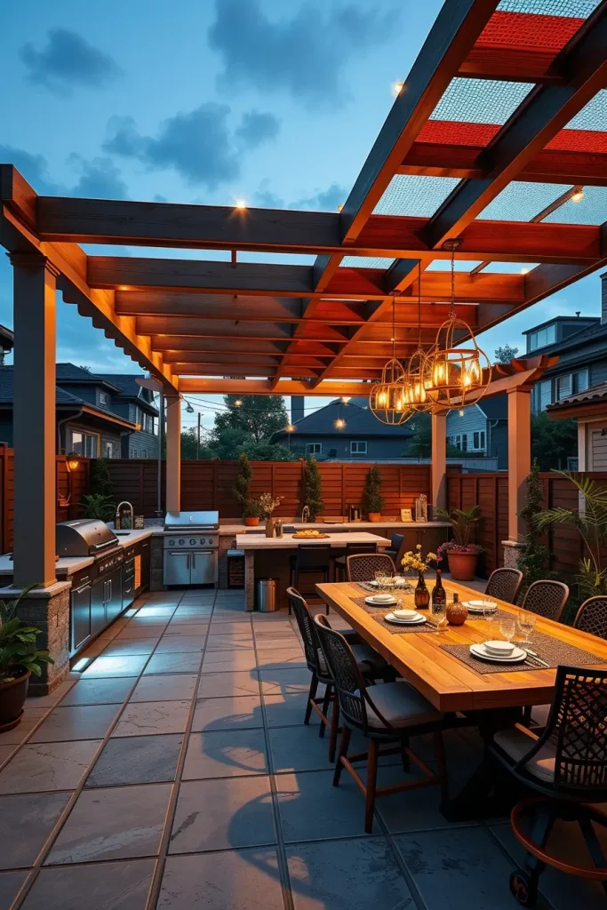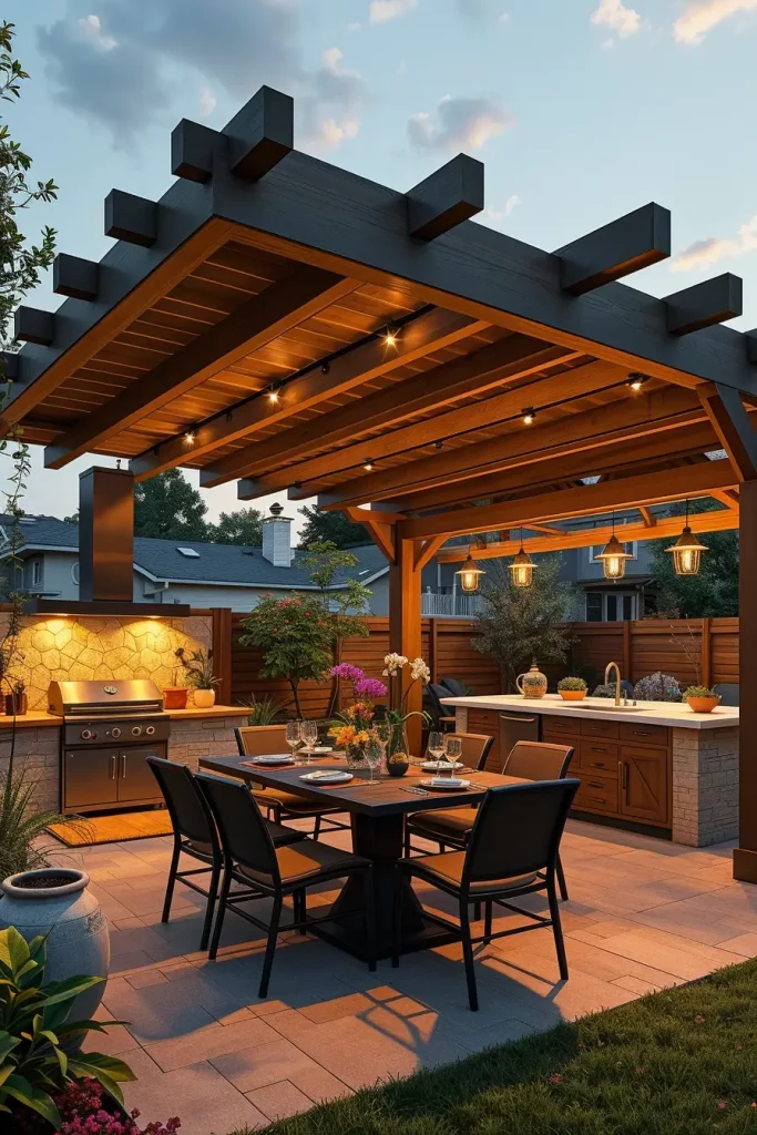 Furniture in these spaces typically includes a full outdoor kitchen setup, a large communal table, and flexible seating arrangements. Integrated LED lighting within the pergola beams enhances usability after sunset and creates a welcoming atmosphere without overpowering the space.
