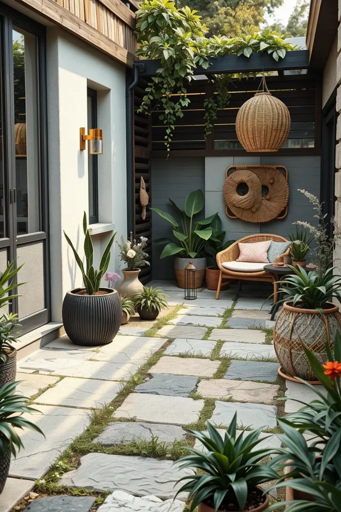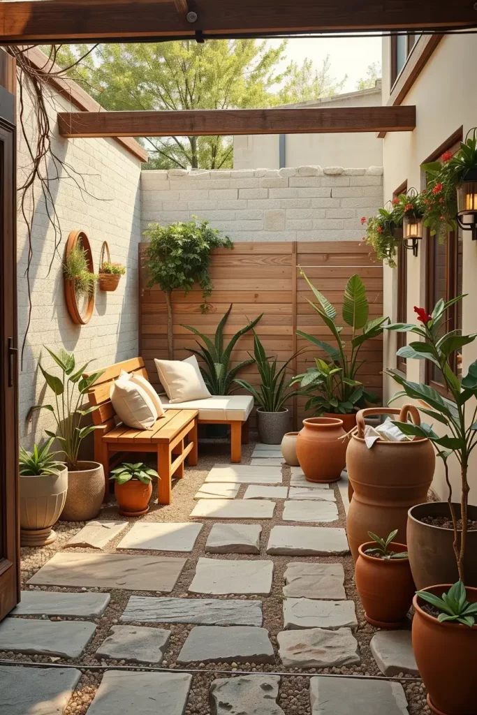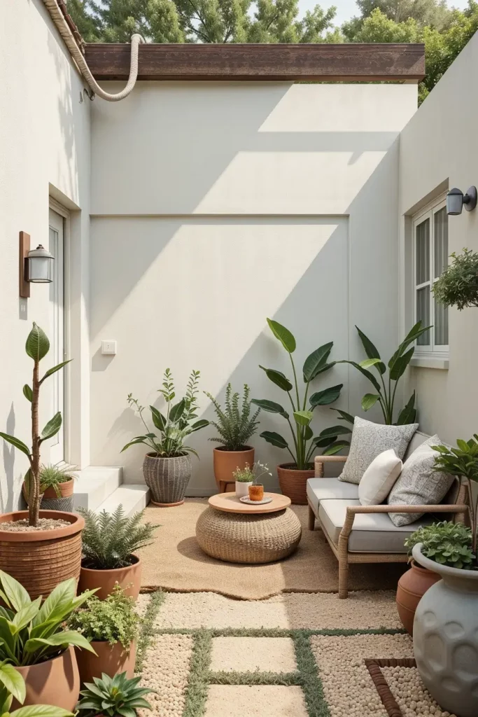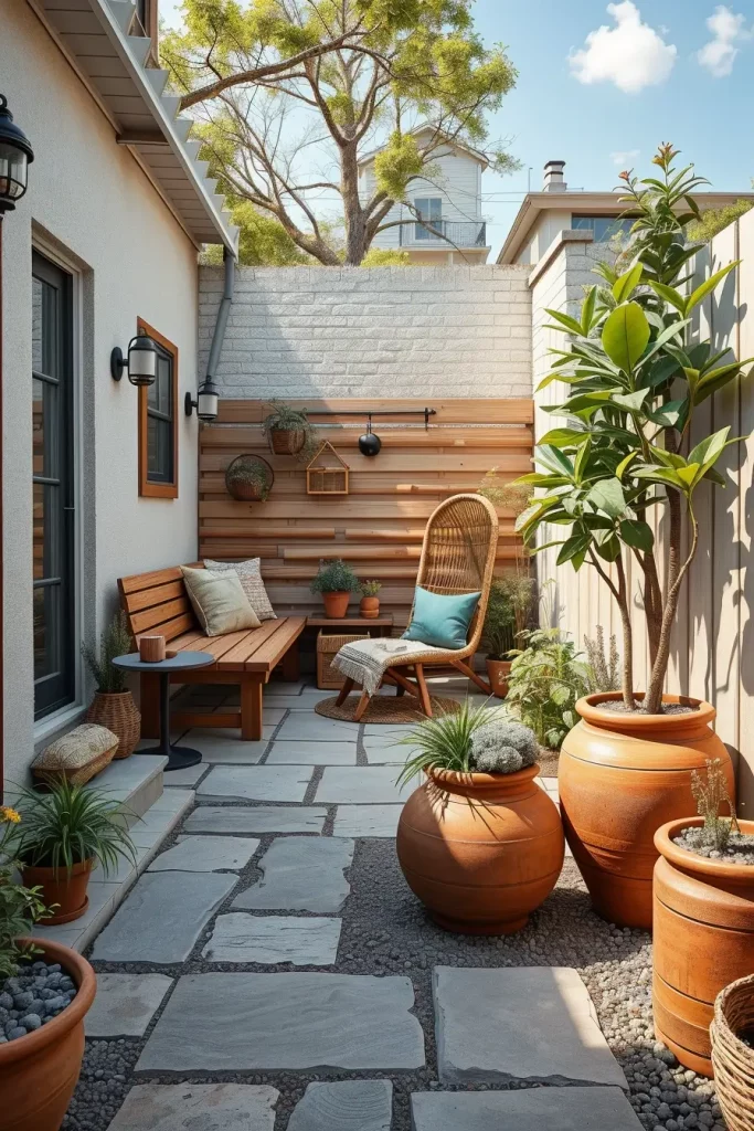 Wood, natural stone, clay planters, and woven outdoor textiles form the foundation of this approach. I select materials that weather gracefully and enhance the garden’s character over time while remaining suitable for small-scale layouts.
