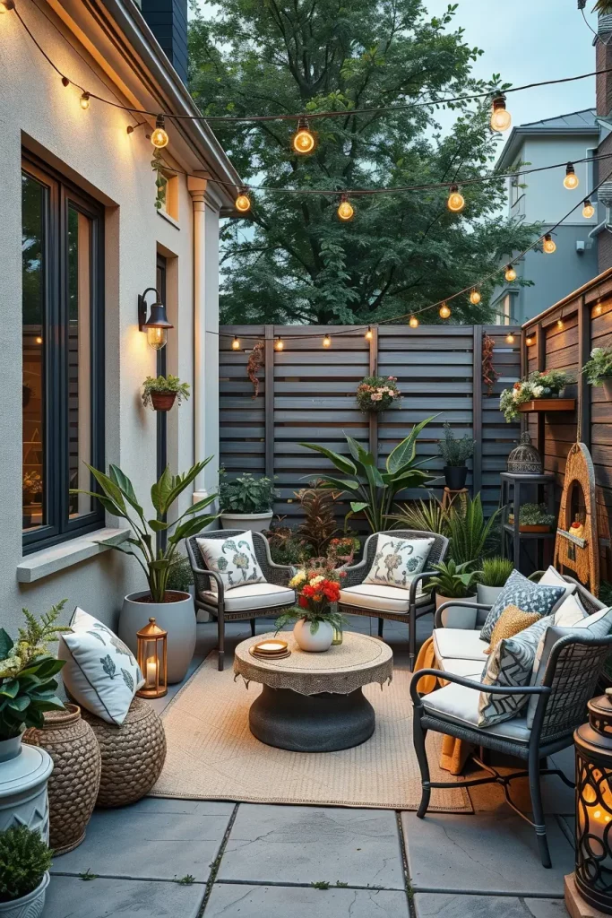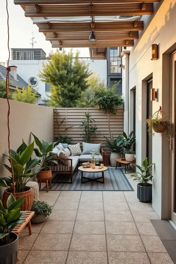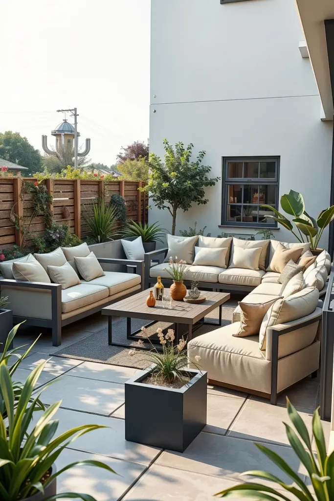 I frequently use vertical decor such as slim trellises, decorative screens, and tall planters with structured greenery. These elements define boundaries while still allowing light and airflow. Materials like composite wood, metal mesh, and textured outdoor fabrics provide privacy without creating a boxed-in feeling.