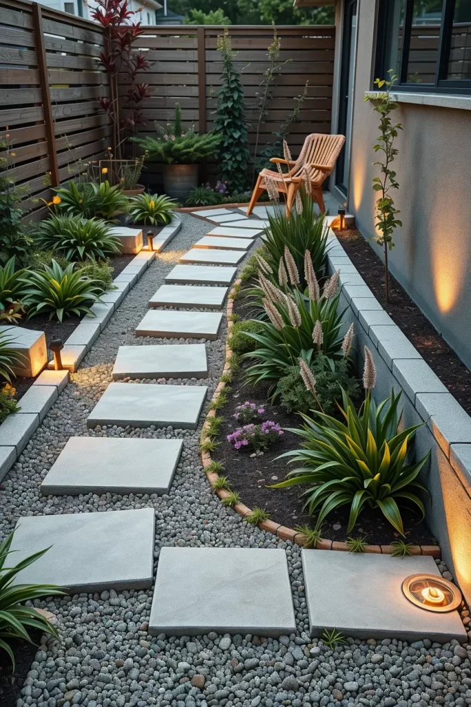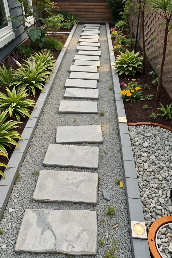 I prefer materials such as concrete stepping stones, natural stone slabs, or textured pavers placed with intentional spacing. Low-profile edging, gravel insets, and integrated ground lighting help elevate the pathway without adding bulk. These choices allow the garden to feel structured while remaining light and accessible.
