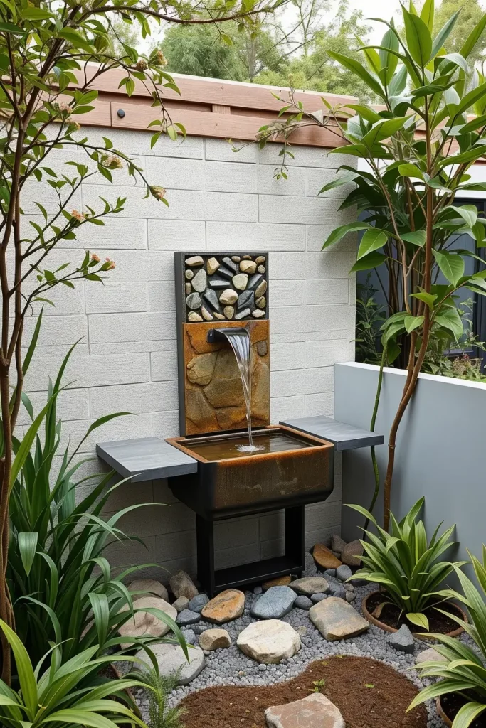 I suggest wall-mounted fountains, narrow reflective basins, or tabletop water features with minimalist designs. Materials like stone, metal, or matte ceramic work well for modern gardens, while concealed pumps keep the setup visually clean and quiet.