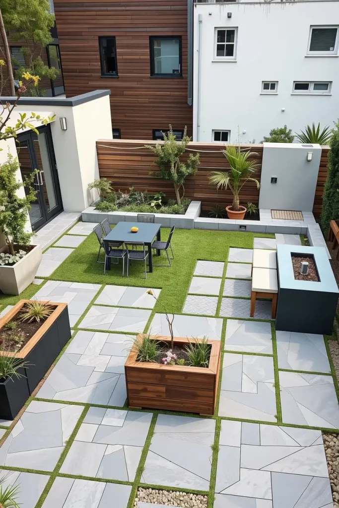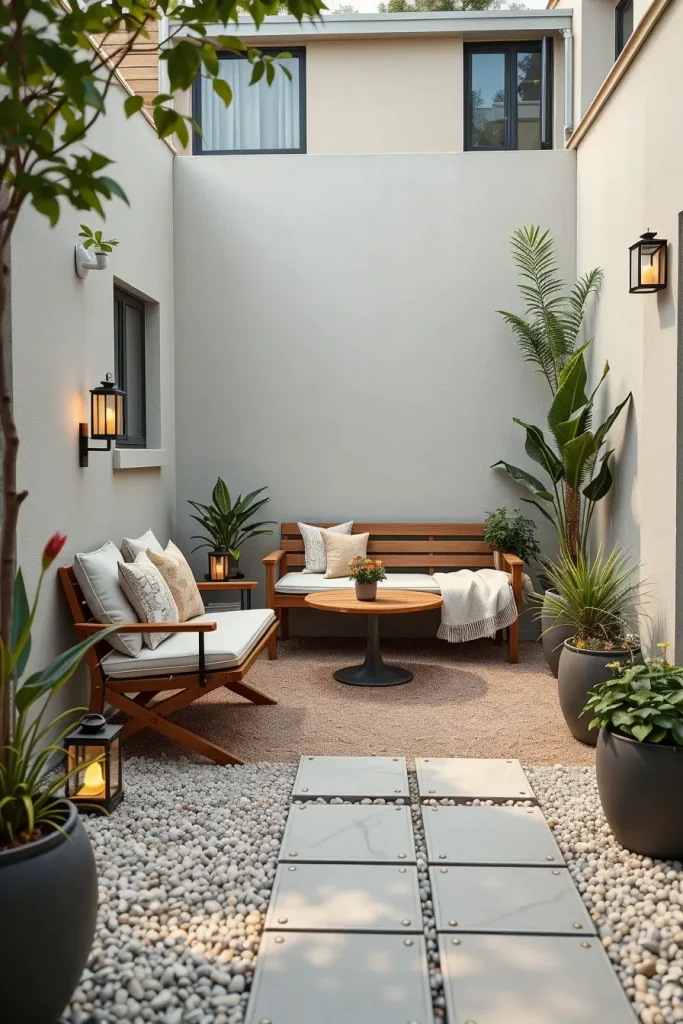 In practice, I often use rectangular paving slabs, narrow gravel paths, and raised planting beds to guide movement through the space. Foldable chairs, compact dining sets, and linear benches align naturally with these layouts, reinforcing a contemporary feel while maximizing usability.