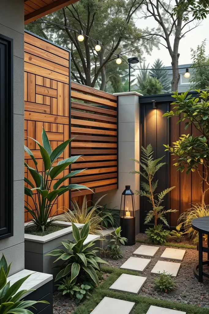 I recommend materials such as wood slats, metal panels with geometric cutouts, or composite screens in neutral tones. Vertical designs visually raise the height of the garden, while semi-open patterns allow light and air to pass through, maintaining an open and welcoming atmosphere.