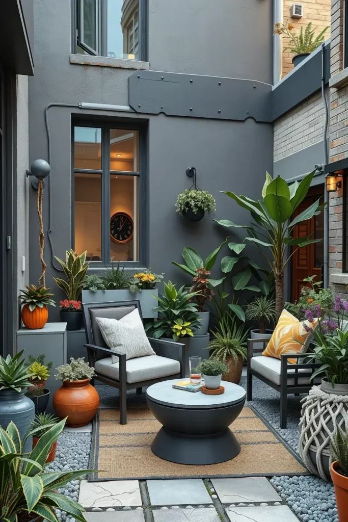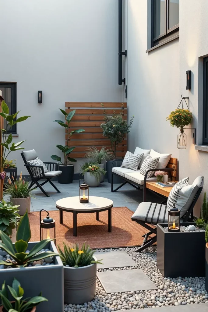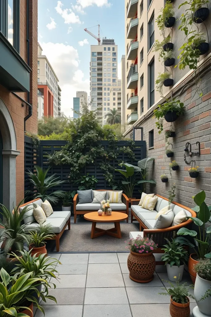 I recommend compact seating, decorative screens, vertical greenery, and subtle lighting to soften hard city surroundings. Materials like concrete, metal, and composite wood blend well with urban architecture while maintaining a modern look.