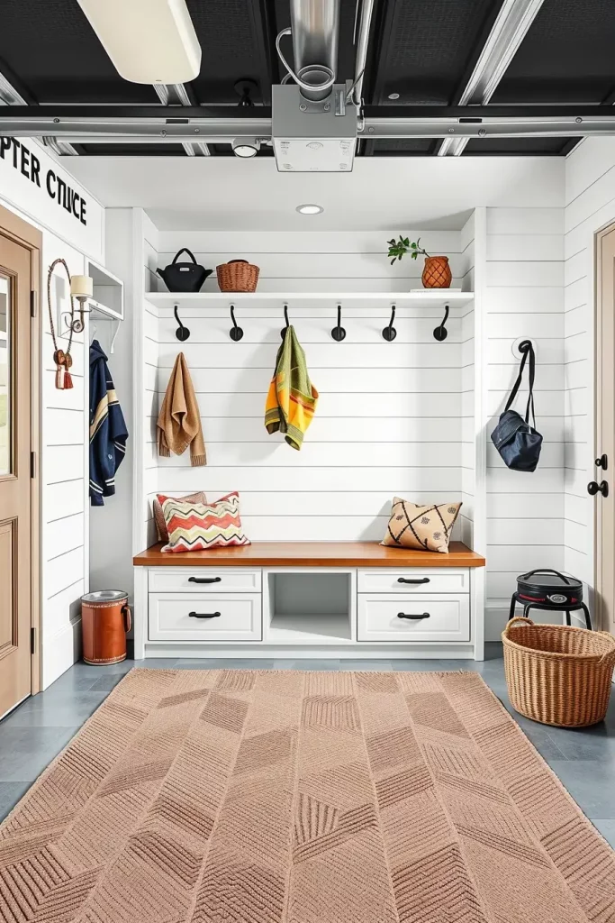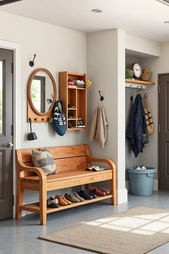 My go-to design includes a narrow bench with concealed shoe compartments, a vertical cubby for frequently used shoes, and coat hooks above. The finishing details are also important. The garage cabinetry is made of wood or laminate so the rest of the furnishings should match. To enhance the aesthetic, I place a washable rug, some wall decor, and even a mirror.