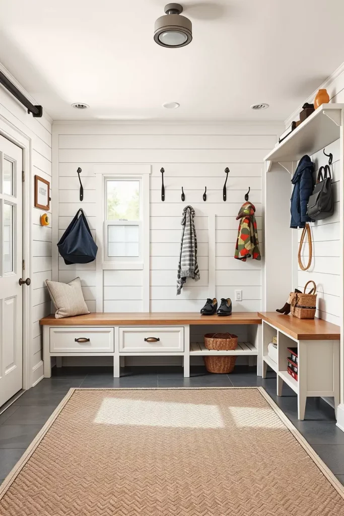 Best of all, a built-in bench with drawers underneath works seamlessly. Make sure to pair it with vertical shiplap or beadboard paneling in soft grey or white tones. Design also includes overhead cubbies with a shoe rack below and double wall hooks. Lastly, a textured rug in neutral tones enriches the design while providing a welcoming feel.