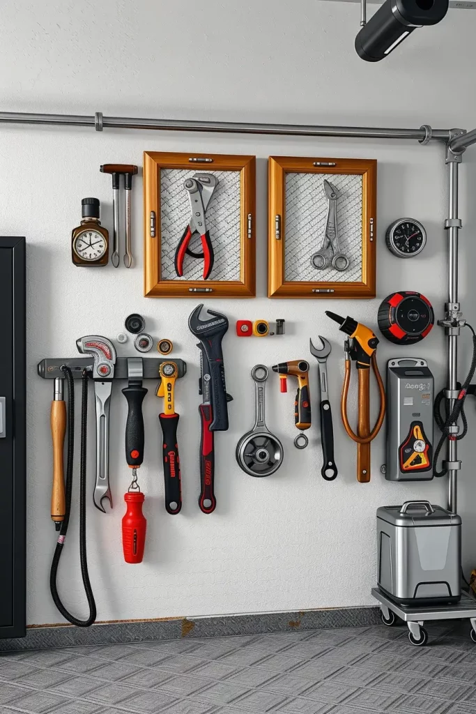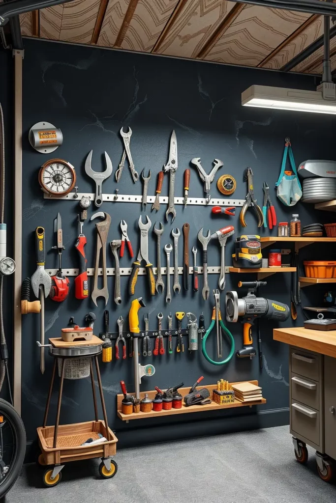 Personally, I tend to rely on heavy duty wall-mounted tracks with adjustable hooks, magnetic tool strips, and wire holders. To make it even better, the wall behind the tools can be coated in dark charcoal or soft slate to achieve a more sophisticated feel. A small workbench stationed in front of the wall anchors the entire arrangement. Overhead task lighting is always reccomended in addition as it improves the functionality of the area during nighttime.