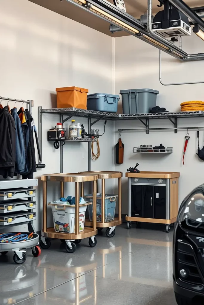 One of the best ways to keep a garage organized is to use mobile rolling carts. Not only are they easy to move, but they can provide organized storage as well as be stored away when not used. My favorite are multi-tiered carts, especially metal framed ones with locking angled wheels for added security.