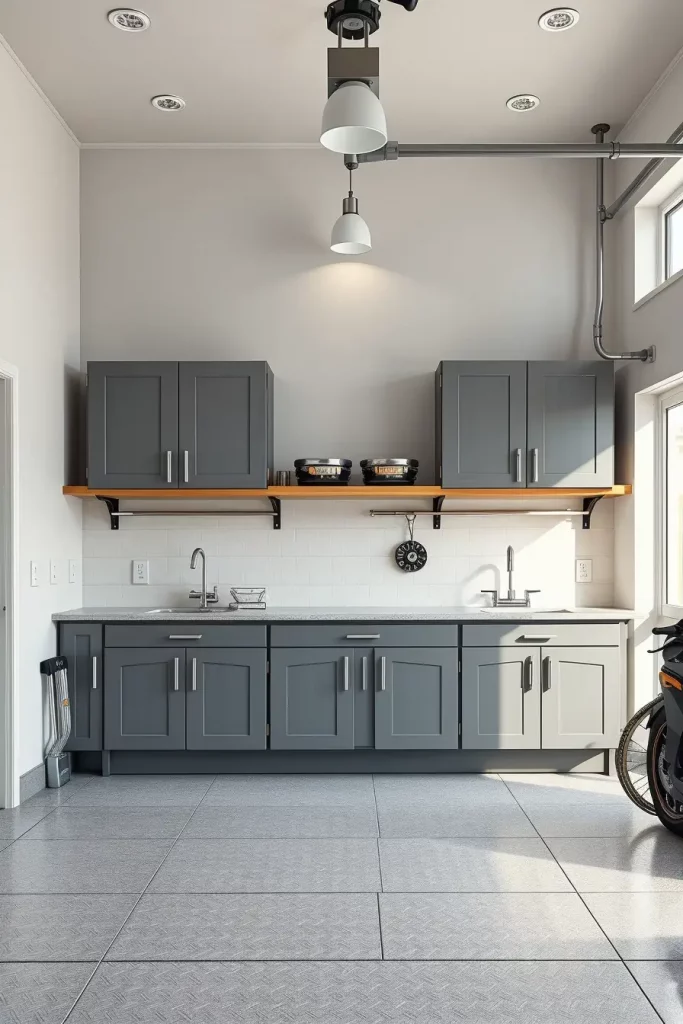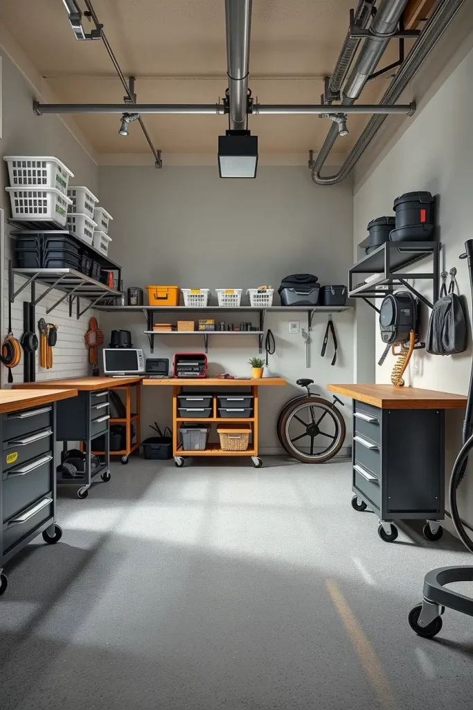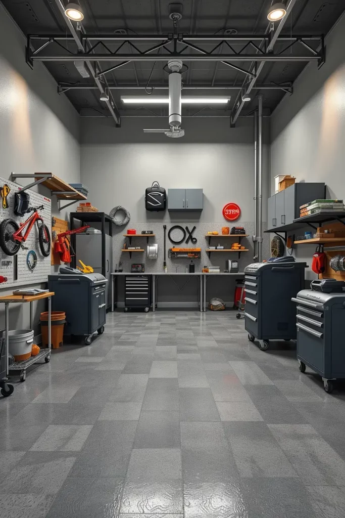 Consider mixing up cabinets with pegboards, carts, ceiling racks, and even mobile tool boxes. The garage floors must be durable but modern like sealed concrete or epoxy in a beige or gray tone. Consider including both ambient lighting as well as targeted task lights. The walls also require neutral colors, light gray is advised to enhance the perception of space.