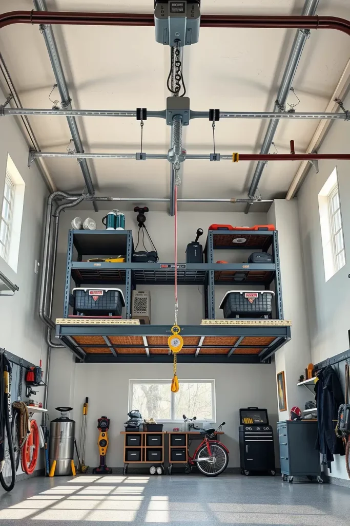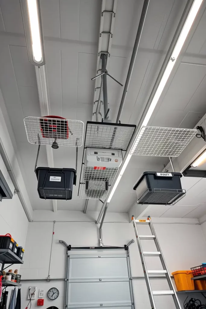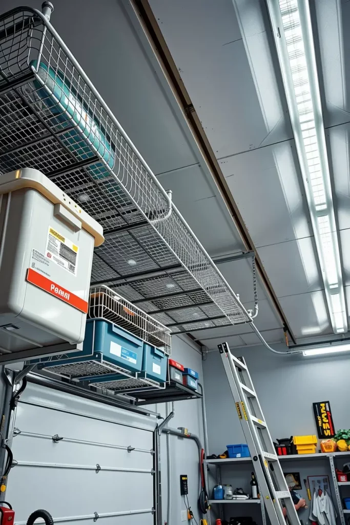 Overhead storage is perfect for those looking to save up on floor space. In my work as a designer, I love to recommend ceiling-mounted racks paired with retractable pulley systems. These neatly store away things like seasonal decorations, camping equipment, or even spare tires while still being readily available.