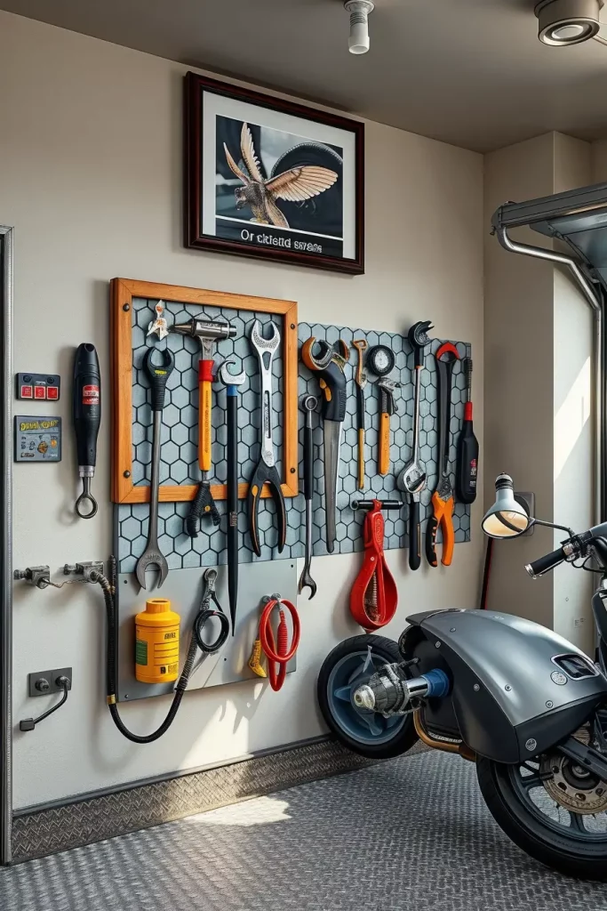 A pegboard system is undeniably one of the most versatile and visually appealing for tool and accessory storage in contemporary garages. It never ceases to impress me how something so simple can offer such an intricate and customizable solution. Well-painted or finished pegboards are not only practical, but stunning. They can effortlessly anchor the workspace’s aesthetics.