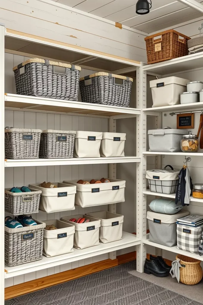 Storing items for each season doesn’t mean messy plastic boxes stacked into corners. For me, the approach that is more refined is using coordinating fabric bins, woven baskets, and clear modular containers. These are arranged on open shelves or placed inside labled cabinets of the garage that match its overall style.