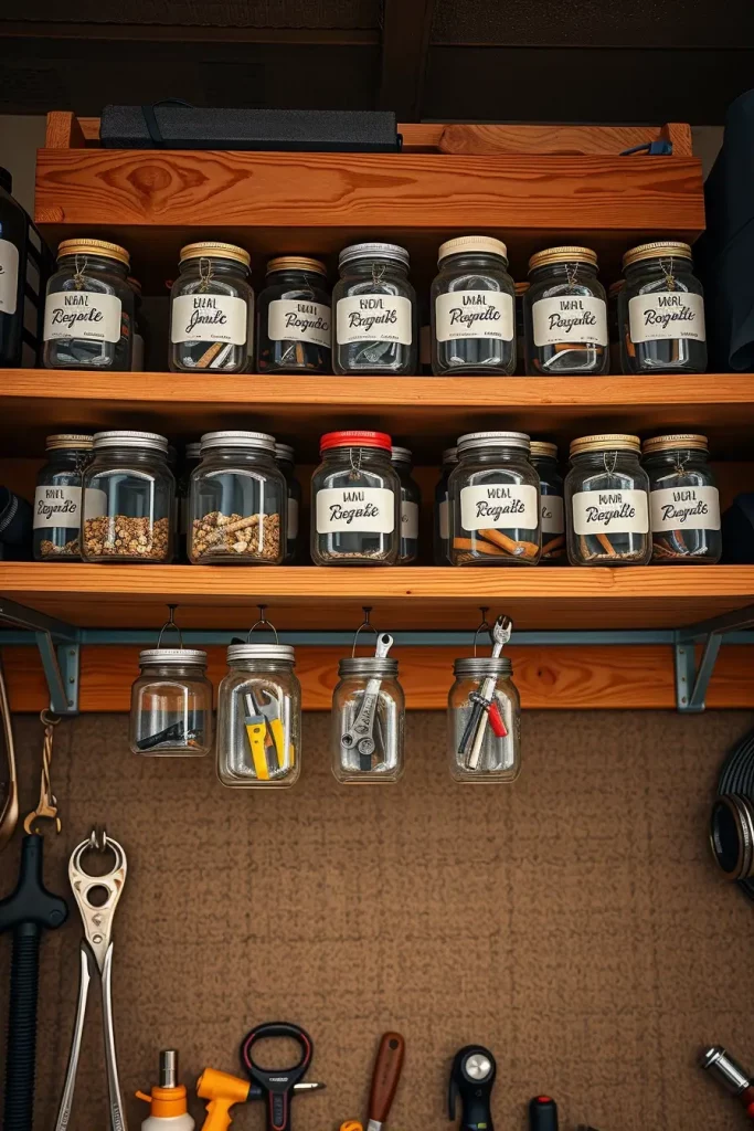 A glass jar display on a shelf is the epitome of small-item organization. I’ve applied this method with nails, screws and bolts, and even paintbrushes. This organization technique is not all about functionality; it is elegant, can be surprisingly cheap, and most importantly, uniform. It also adds a cohesive aesthetic to your garage shelves.