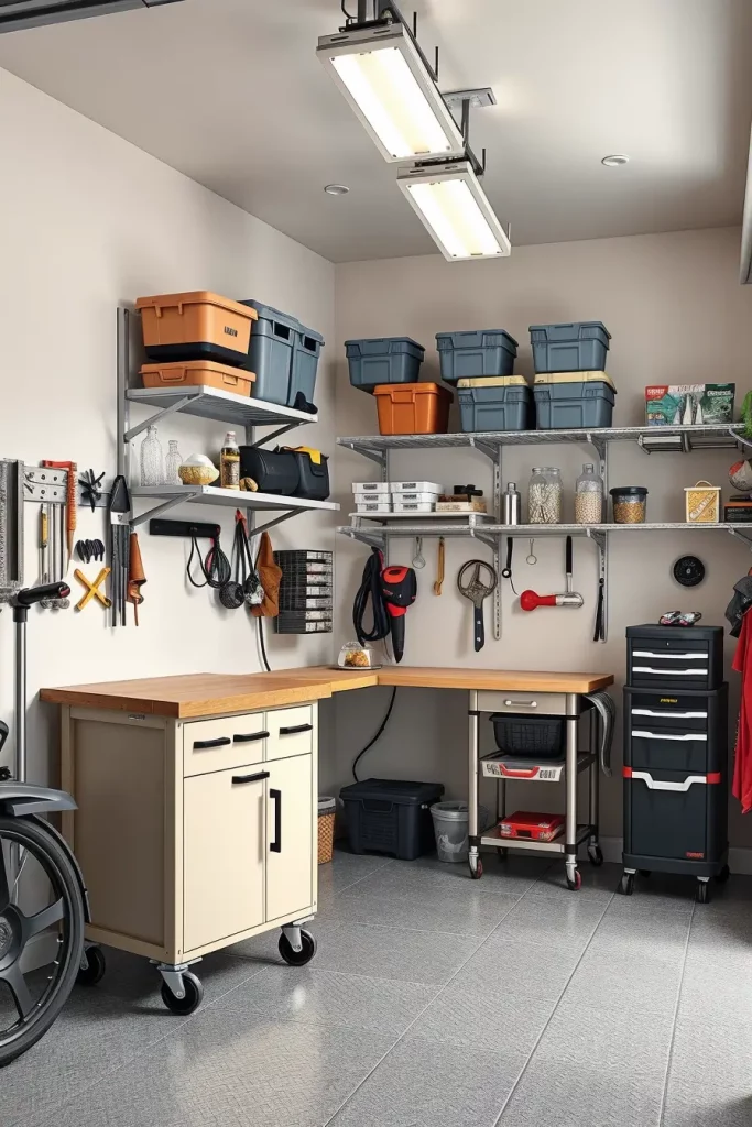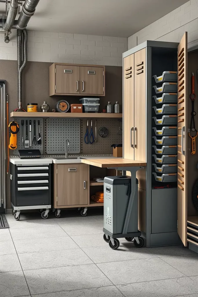 In smaller garages, multifunctional furnishings are vital. Everything from storage benches to folding work tables, as well as seating topped rolling storage cabinets, increase adaptability and style.