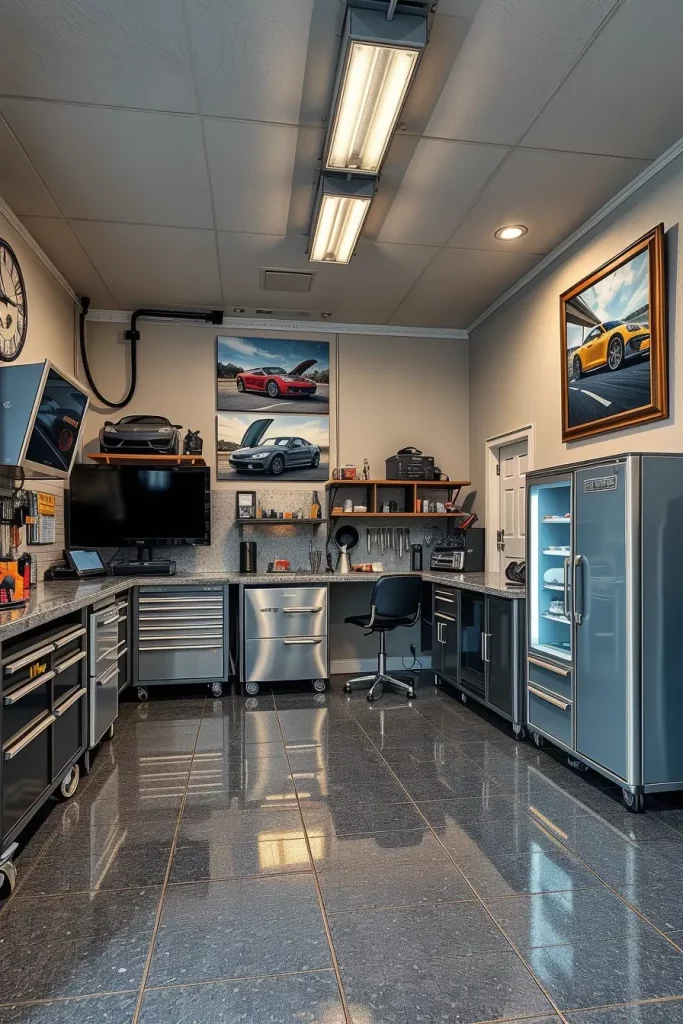 I suggest adding sophisticated looking floors like epoxy coated ones in grey or preferably neutral shades. Furnish with metallic tool cabinets, detailing product cubbies, and a fridge and/or a little television for casual breaks. Moderated garage lighting is also important, hence, I combine shelf illumination and LED strips to ceiling which truly brings out the automobile as a piece of artwork.