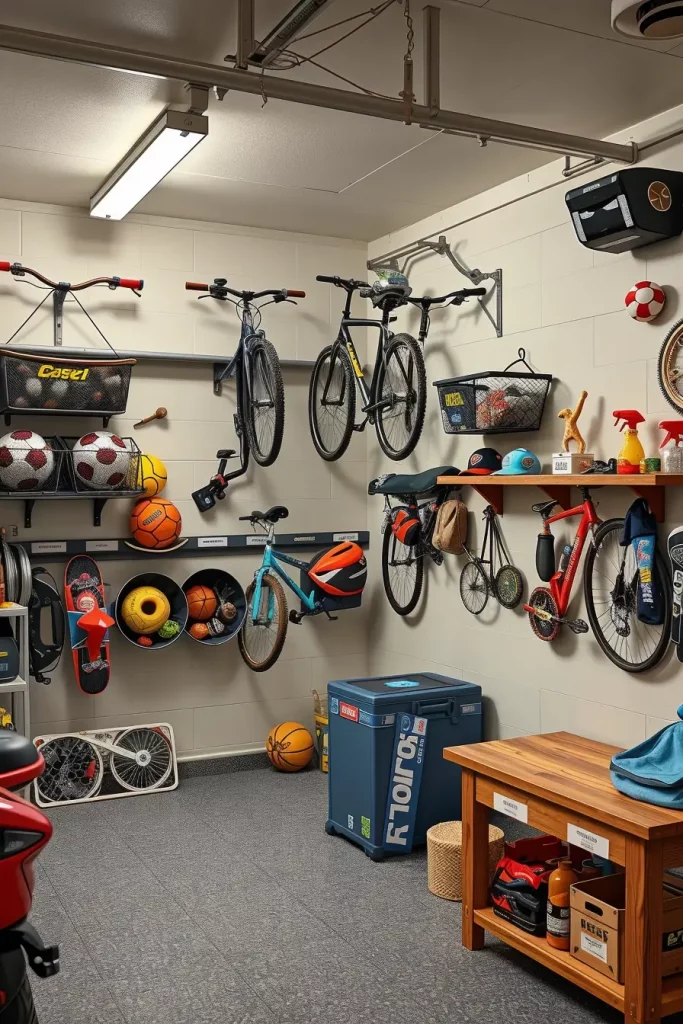 For families with cars, sporting equipment can easily add up (bikes, balls, helmets, etc.) and take quite a large storage space. I sort these into categories: wall-mounted racks, vertical bins, and ceiling hooks that divide items by sport or how frequently they are used. Having a dedicated wall for sports makes the garage more organized and appealing.