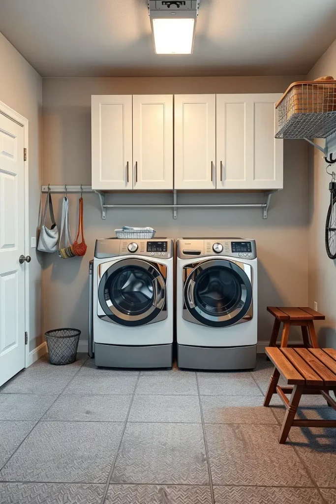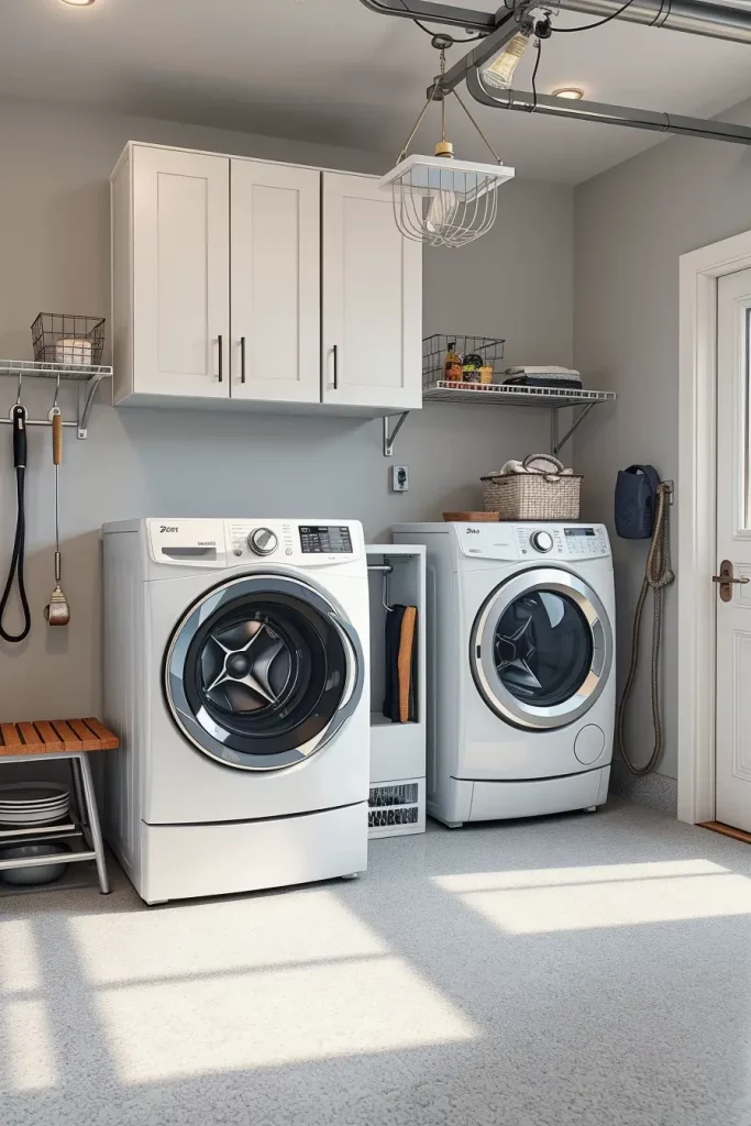 In terms of items, I always go for front-loading washers and dryers, preferably a matching pair. Closed upper cabinets are essential for concealing detergent and supplies, and a foldable ironing board eliminates clutter while maximizing convenience. For sitting places or laundry folding, a narrow wooden bench adds warmth. Don’t forget open shelves with sorting wire baskets for easy access. Each part is selected not only for its functionality but also for the overall style of the garage.