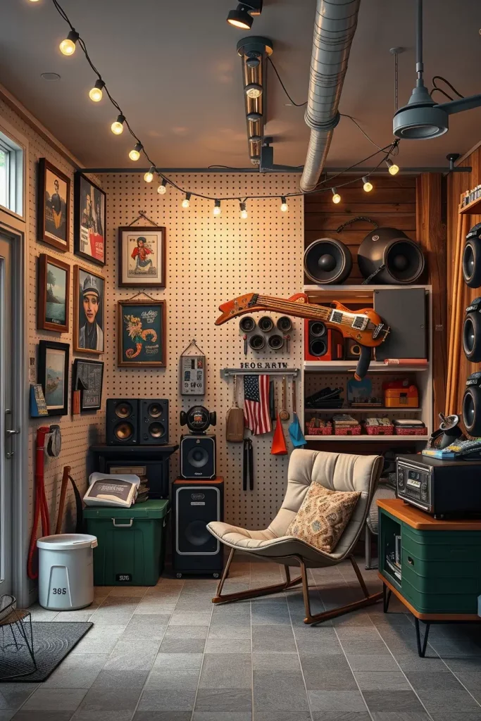 Often, I used to do overhead string lights for ambient lighting. Pegboard walls painted in custom colors to a client’s favorite hue are also a favorite of mine. To brought the look together for a homeowner, I added eloquent reclaimed wood feature walls which also adds warmth and textures, and paired it with simple speaker system concealed in a cupboard to enhance comfort. Small decorative baubles such as retro clocks or branded bins for storage completed the look.