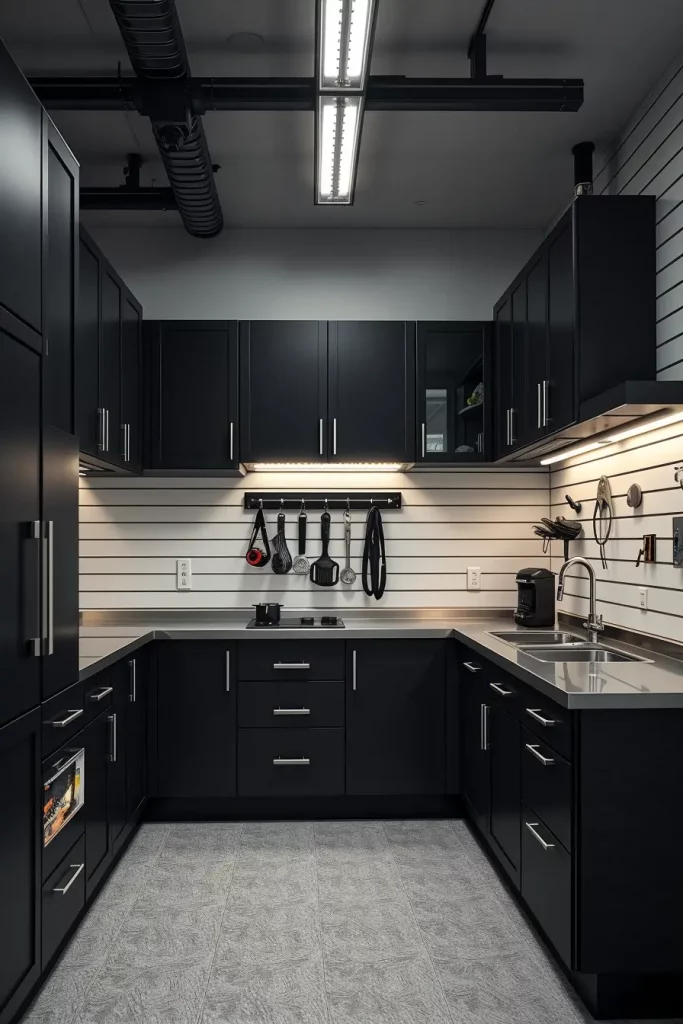 To further enrich this setup, I would mount LED lights underneath the wall cabinets and install a slatwall panel for smaller tools. This elegantly integrates streamlined industrial function with sophisticated home aesthetics.