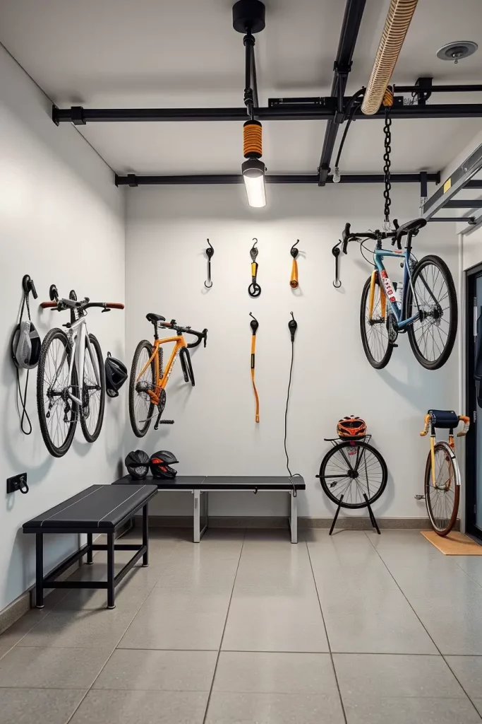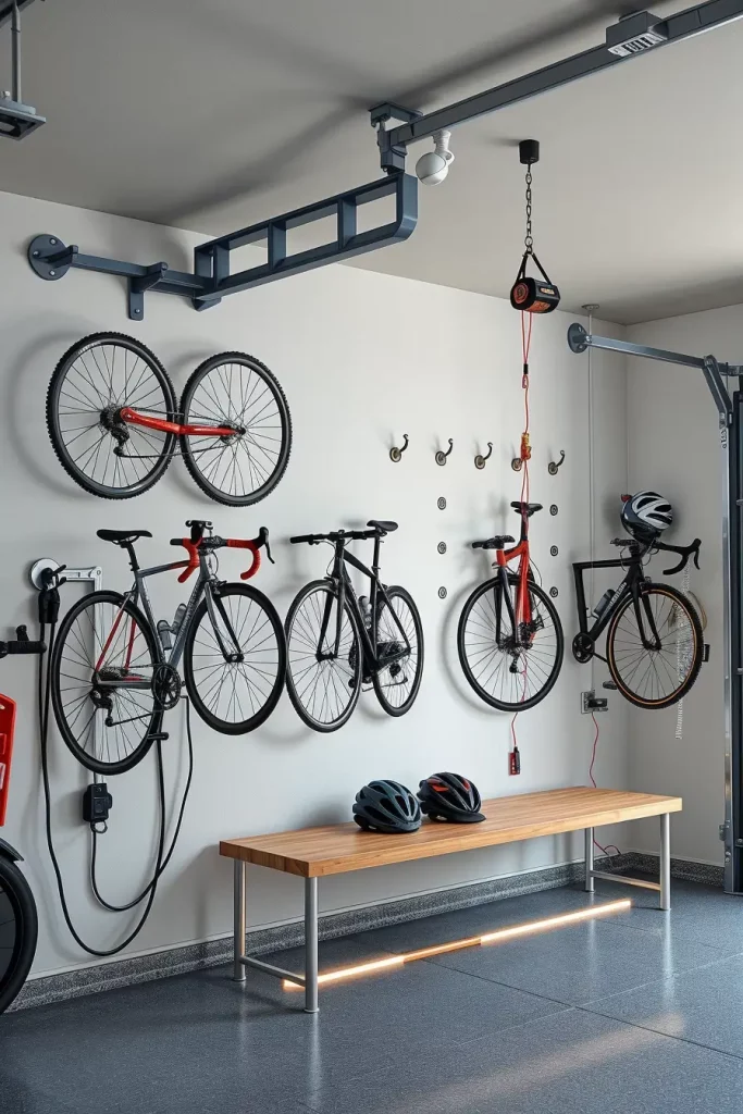 To optimize space, my favorites include ceiling hoists for lighter bikes, wall-mounted vertical racks, and horizontal side-by-side display rails. The design should be purposeful—choose black steel mounts that feature rubberized hooks to protect against scrapes. Add a small stool, further down the bench, and make a complete mini cycling station by using the seat as gear and helmet storage.