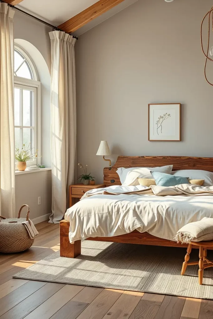 I like combining layers of organic cotton sheets, duvets, and pillowcases in relaxing colors. Combined with a reclaimed wood bed frame and linen curtains, it is sustainable and contemporary. All the decisions are sustainable and have a classic and elegant appearance.