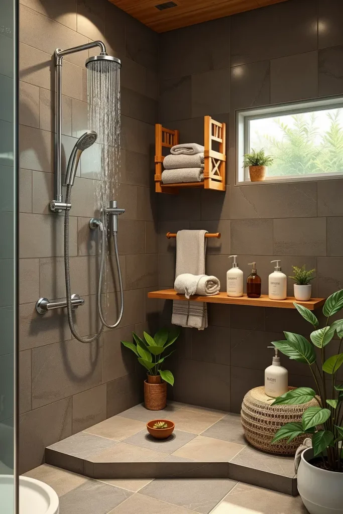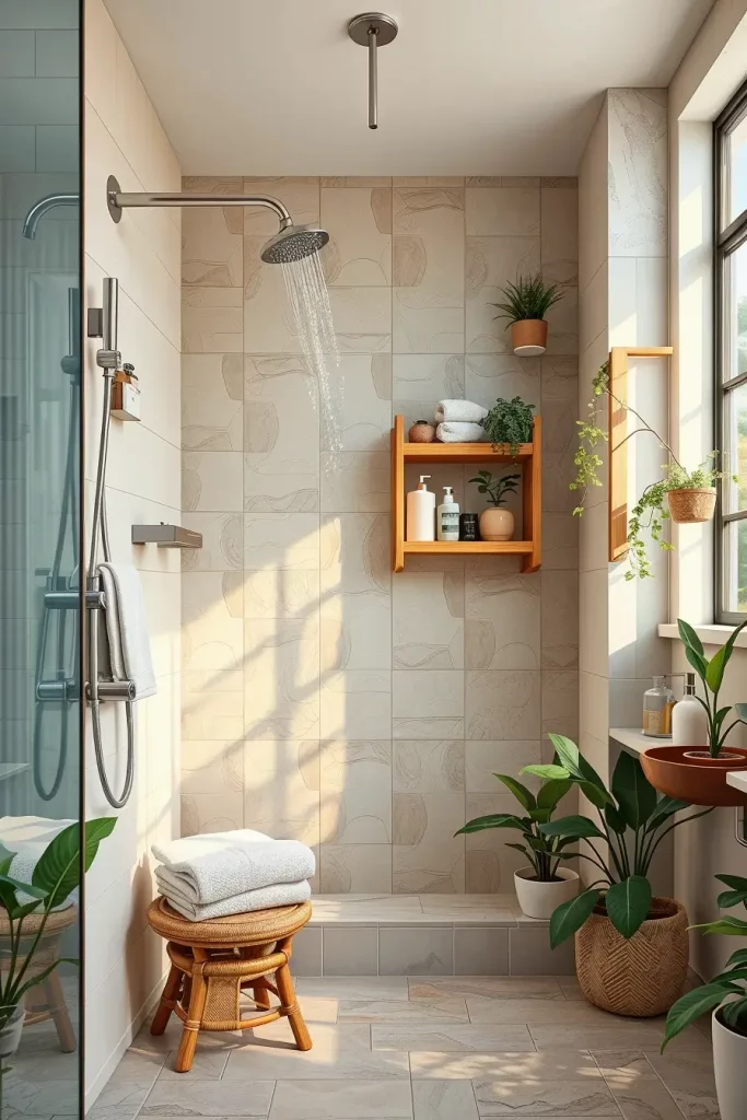 I have fitted a rainfall showerhead in my own bathroom which is meant to save water and coupled it with natural stone tiles and bamboo storage racks. These materials create a spa-like environment at the expense of sustainability. The setup is topped with small details such as organic cotton towels and refillable soap dispensers.
