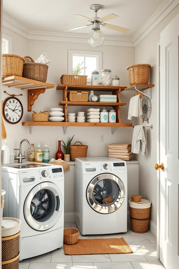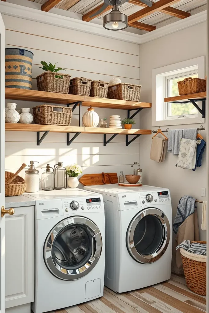 I also put wool dryer balls, rather than single-use sheets, and refillable detergent containers that minimize packaging waste. The space has an appearance of natural organized space with open shelving that is made of reclaimed wood and woven baskets. Combining them with energy-efficient appliances does not only conserve resources, but also gives a clean, modern look.