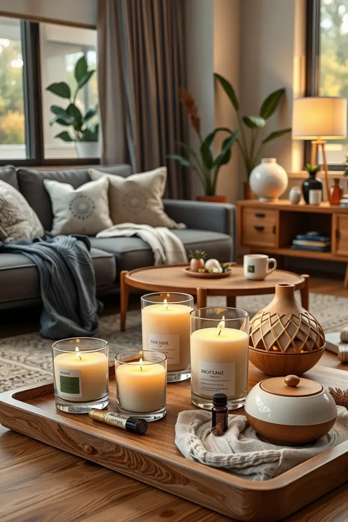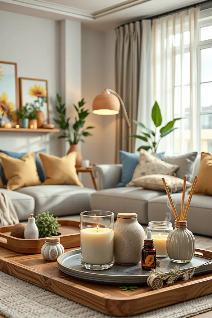 I have a couple of hand-poured soy candles in glass jars that I store in my living room and can use again. I also have a ceramic essential oil diffuser such as lavender and eucalyptus. Not only do these elements freshen the air but they also add to my decor with their minimalistic design. They are combined with wooden trays and small ceramic holders, which makes them useful and decorative.