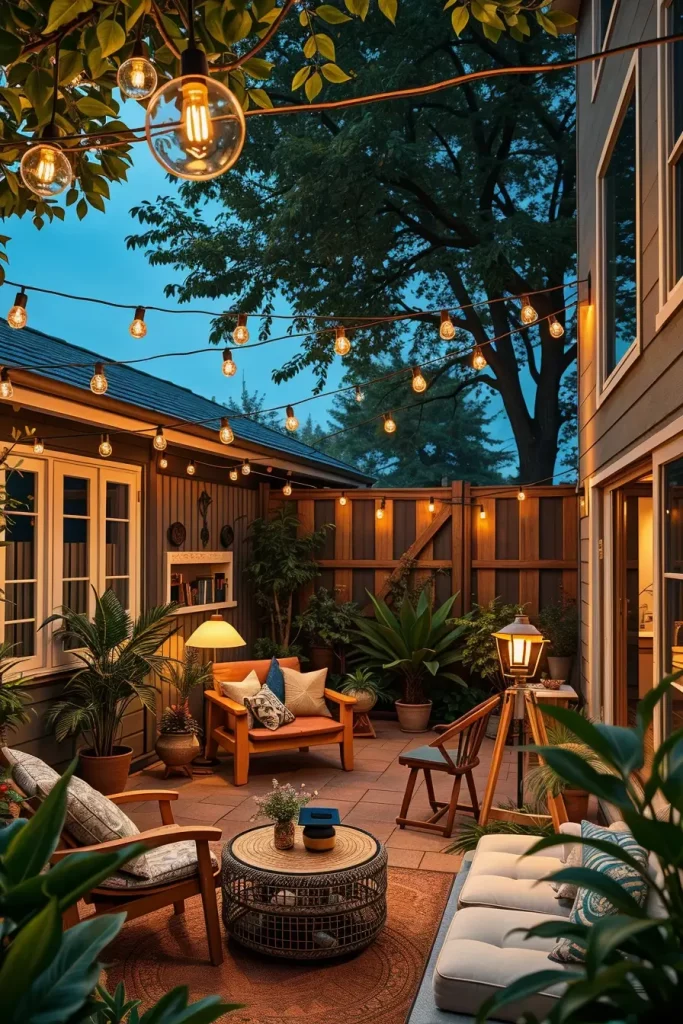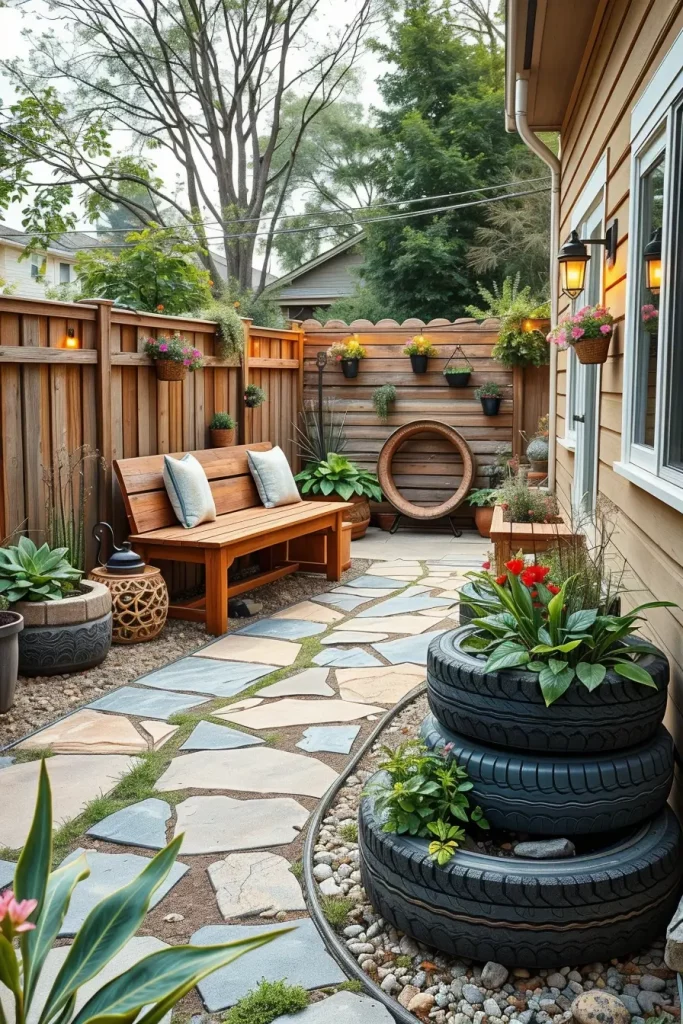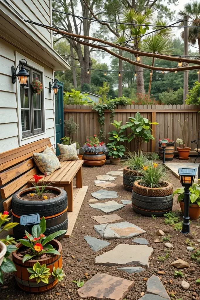 My patio has wooden benches constructed of reclaimed pallets, and I have added planters constructed of recycled tires. These not only reduce waste, but also introduce creativity and originality to my outdoor space. They can be combined with solar-powered lights, which makes the environment beautiful and environmentally friendly.