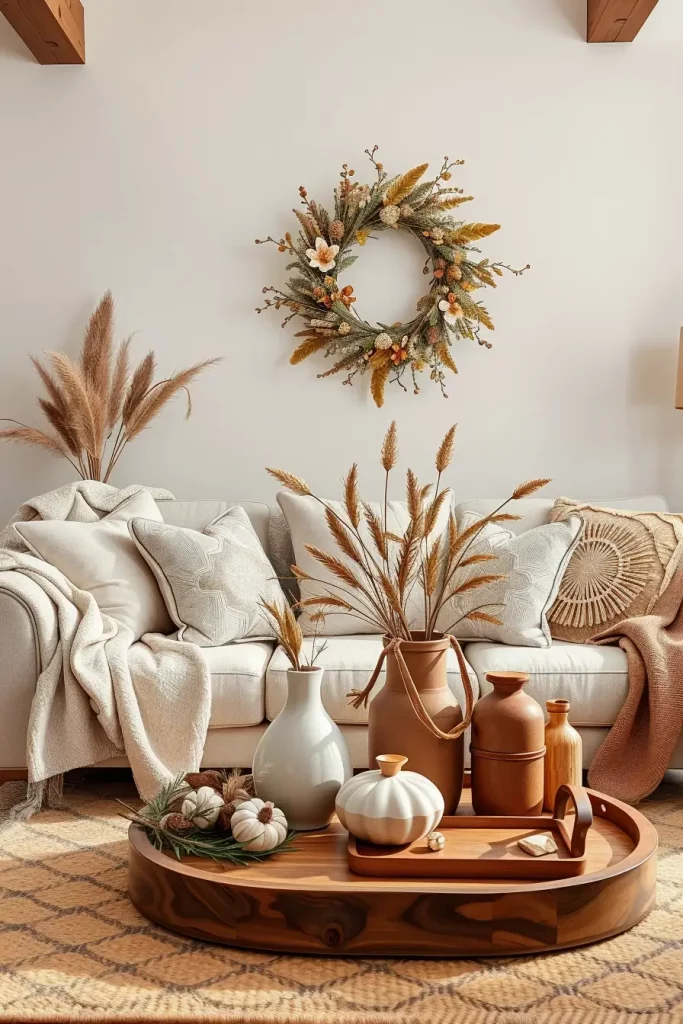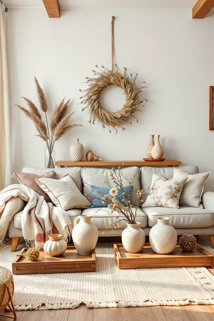 As an example, I have neutral-colored throws and pillows which can be altered in their style depending on the season. Wreaths made of natural plants that are dried are much more durable and can be reused with minor modifications. Wooden trays and ceramic vases are classic items that can fit in summer and winter appearance.